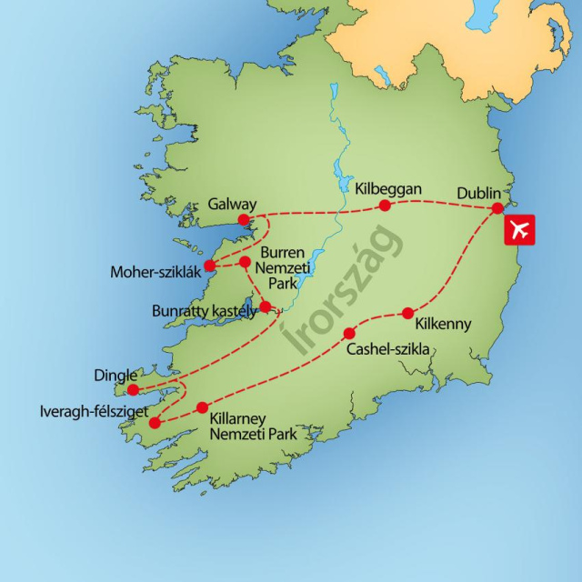 Az Ír Köztársaság leghíresebb természeti látnivalójához, a Moher sziklákhoz naplemente idején érkezett csapatunk, s mondani sem kell, hogy fenséges látványban volt részünk: a napsugarak káprázatos fénnyel aranyozták be a több, mint 200 méter magas, tengerbe szakadó sziklafalakat. A nyugati partvidék másik bebarangolásra váró látnivalója a Connemara Nemzeti Park, ahol egyedi mocsárvilággal, növényzettel és tőzegmohalápokkal ismerkedhettünk. A környezet, mint majdnem mindenhol ezen a vidéken, itt is festői: zord hegyek, bizarr természeti formák és egykori gleccservölgyek. Már nem is csodálkoztunk azon, hogy a Diamond Hill lábánál elterülő tó partján újra egy csodálatos kastélyra leltünk, a szomorú történetű Kylemore Abbey-ra. A szép, neogótikus kastélyt egy manchesteri mágnás építette a feleségének, de sajnos imádott párja hamarosan elhunyt. A vigasztalhatatlan úr egy apró kápolnát emeltetett halott felesége számára, majd örökre elhagyta Connemarát. Az I. világháborúban belga bencés apácák költöztek ide, s a romantikus épületben mai napig bentlakásos leányiskola működik. A vadregényes tájak és szellemek járta kastélyok után bizonyára megérti a vándor, miért mondják azt, hogy ha valaki egyszer eljut Írországba, mindig visszavágyik, s ha teheti, újra és újra visszatér a kelták zöld szigetére.