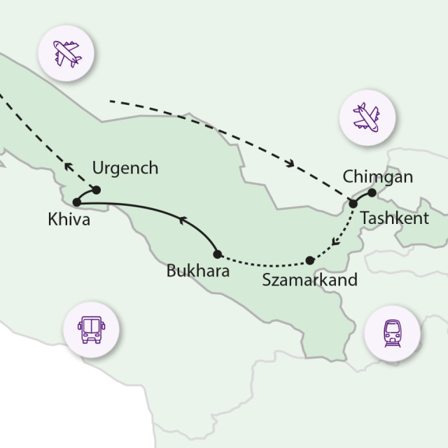 Az utazás során a csoport ellátogat Taskentbe, az üzbég fővárosba, majd Szamarkand, Shahrisabz és Bukhara is terítékre kerül. Taskentben a többi városhoz mérve kevés maradt meg az építészeti remekművekből az 1917-es forradalom és az 1966-os földrengés miatt, ám így is gazdag a szép medreszékben, múzeumokban, valamint a szovjet korszakból megmaradt épületekben és szobrokban. Szamarkandot a "Kelet Rómájának" is nevezik, hiszen a Selyemút központi állomásaként, Kelet és Nyugat között áll. Leghíresebb épülete a Gur Amir mauzóleum, mely állítólag a Taj Mahalt is ihlette. Shahrisabz városa - mint Tamerlán mongol fejedelem születési helye - bővelkedik az emlékhelyként felépített hatalmas épületegyüttesekben, mint a Fehér Palota vagy a Péntek-mecset. Végül Bukhara városa következik, mely számos mecsetével és medreszéjével kivívta magának az UNESCO világörökség címet: itt található a Kalon minaret magával ragadó, 46 méter magas tornya. A borzongás kedvelői is megtalálhatják számításukat Bukharában, mivel a Bárka-erőd várbörtöne és kínzókamrája számukra is tartogat rengeteg érdekességet!