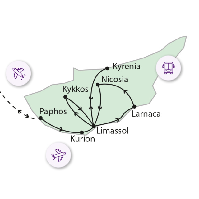 A szállásunk Larnacától 6 km-re volt, helyi busszal mentünk be a városba. A buszozás menetideje sofőrtől függően 15-20 perc, bár a ciprusi sofőrök hozzáállása érdekes: néha megállnak egy-egy szupermarketnél vásárolni vagy a buszfordulónál nem indulnak újra útnak, amíg be nem fejezték a kávéjukat. Türelmetlenkedni nincs értelme, ez a kultúrával jár. A buszjegy egyébként egységesen 1,5 euró egy útra, a sofőrtől lehet vásárolni, akik azért többnyire beszélnek angolul. A szállásunk recepcióján ajánlottak taxikat is 20-30 eurós áron, de mi inkább nem vettük igénybe.
