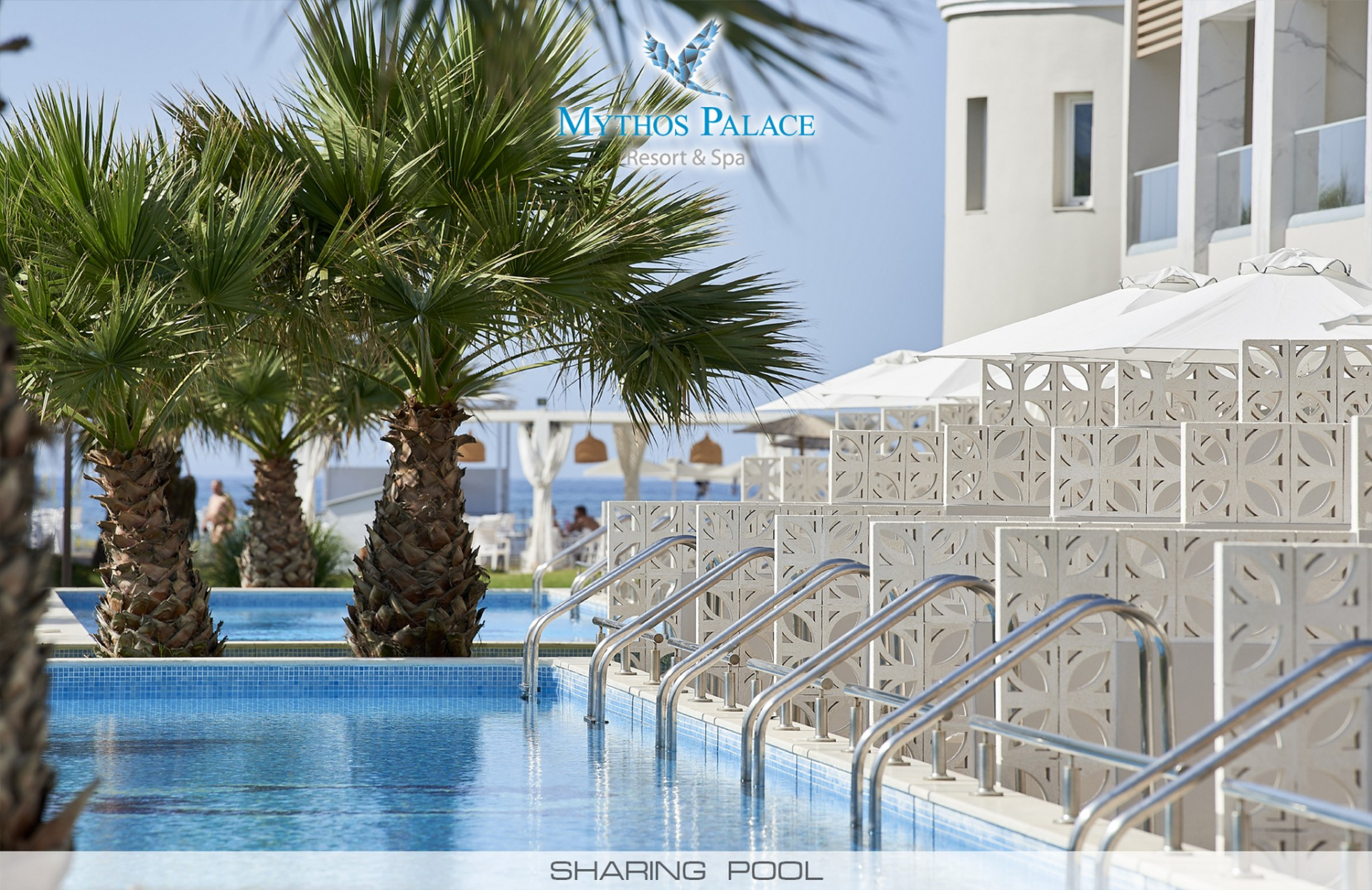 Az 5*-os Mythos Palace Resort & Spa közvetlenül a Kék Zászló-díjas, aranyszínű homokos tengerparton található, ahol privát partszakasszal rendelkezik. A hotel Chania repülőterétől kb.51 km-re, Rethymno belvárosától kb. 20 km-re, Georgioupoli központjától pedig kb. 6 km-re fekszik.