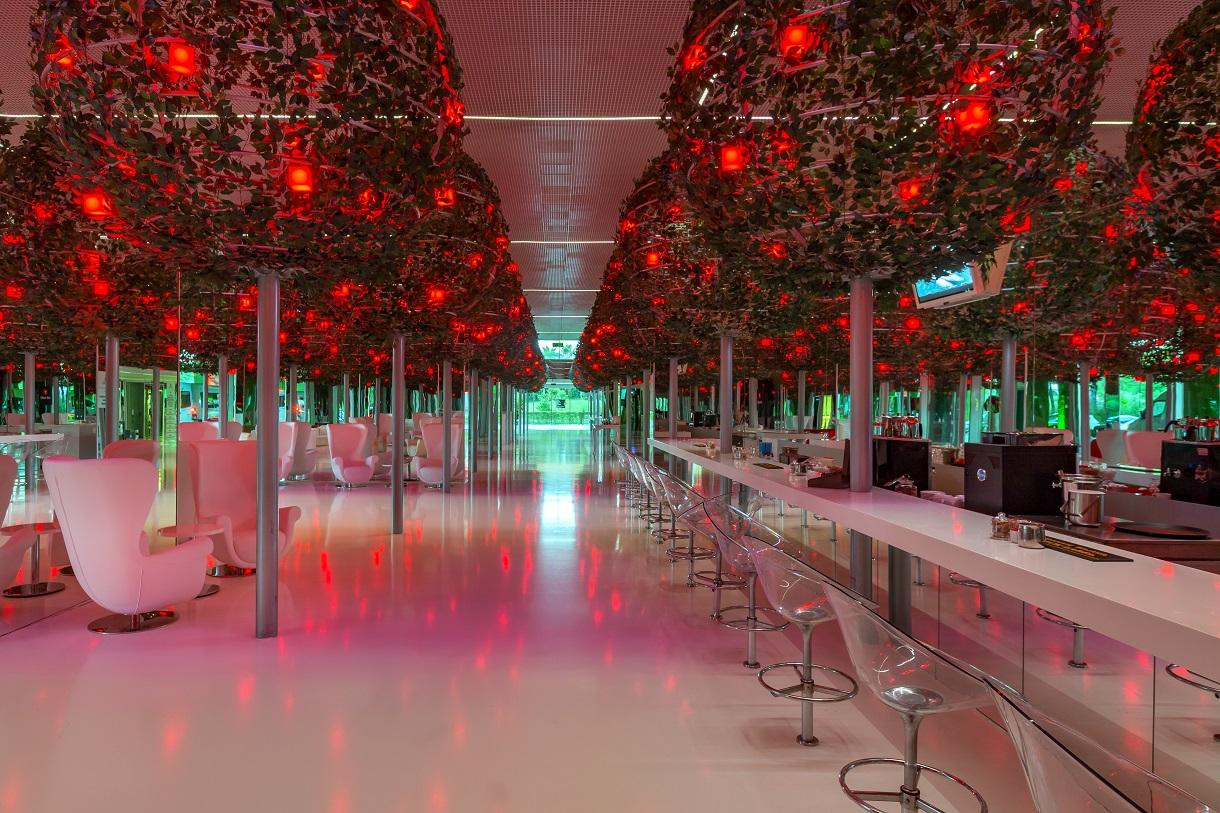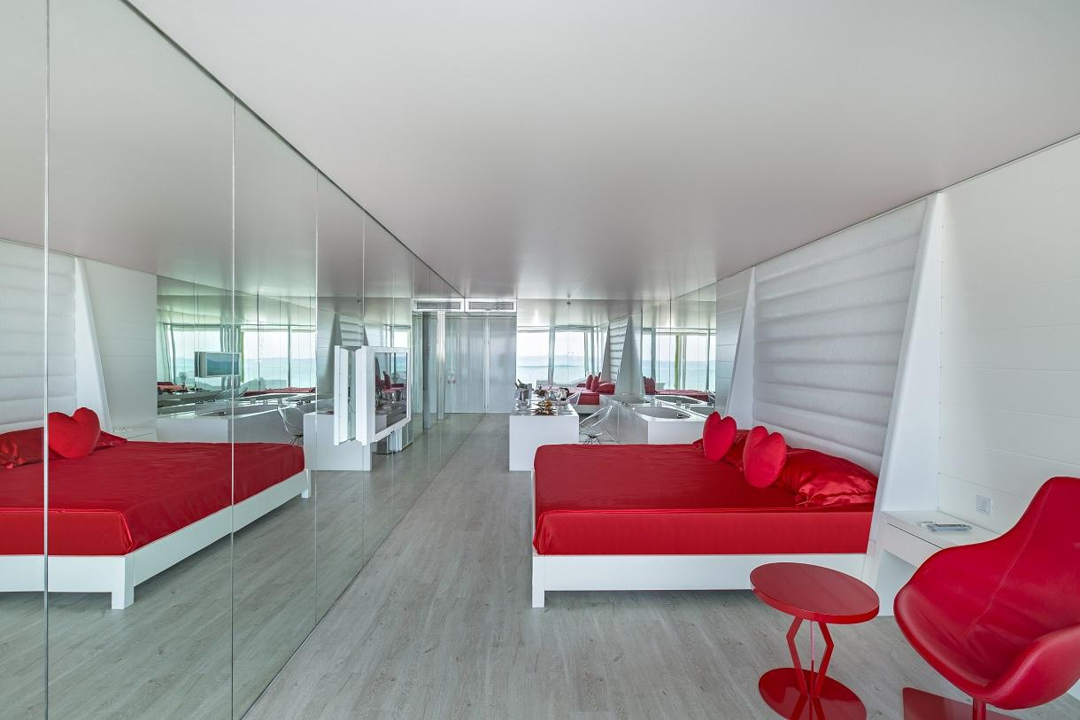 A szobák fehér-piros színűek, illetve a benne lévő tükrök és üvegfalak sejtelmes és erotikus hangulatot árasztanak.