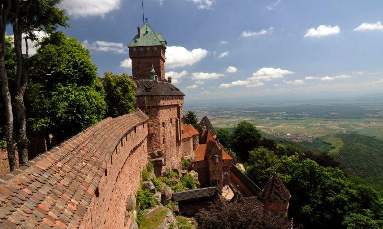 Innen folytatjuk utunkat a közeli Haut-Königsbourg várhoz, amely a Vogézek egyik ikonikus nevezetessége. Ez a lenyűgöző, több mint 700 éves erődítmény a középkori hatalmat és gazdagságot idézi meg. Falai között sétálva megelevenedik a középkor világa, a fegyverek kiállítása és a korabeli bútorok pedig izgalmas bepillantást engednek a lovagok és nemesek életébe. Tornyából lélegzetelállító kilátás nyílik az alatta elterülő szőlőültetvényekre, erdőkre és a Rajna völgyére – tiszta időben még a Fekete-erdő is látható.