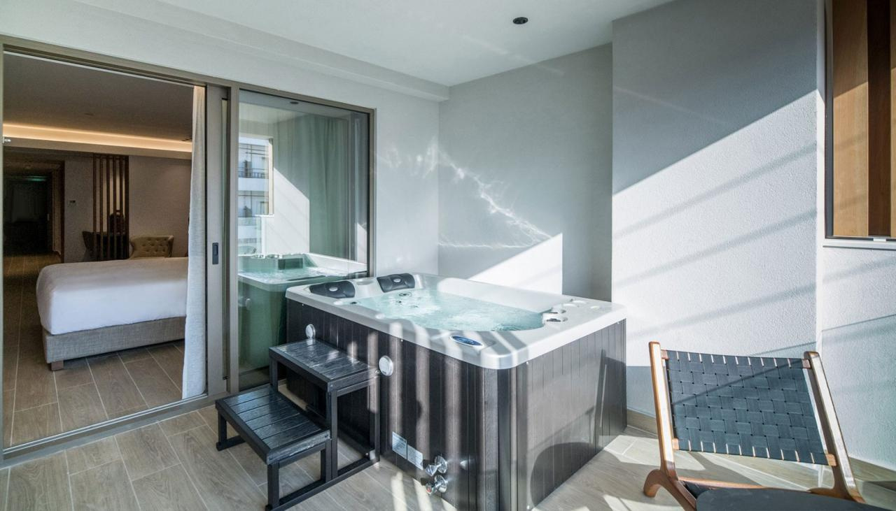 2-es, városra vagy kertre néző szoba, melyek erkélyén jakuzzi található.