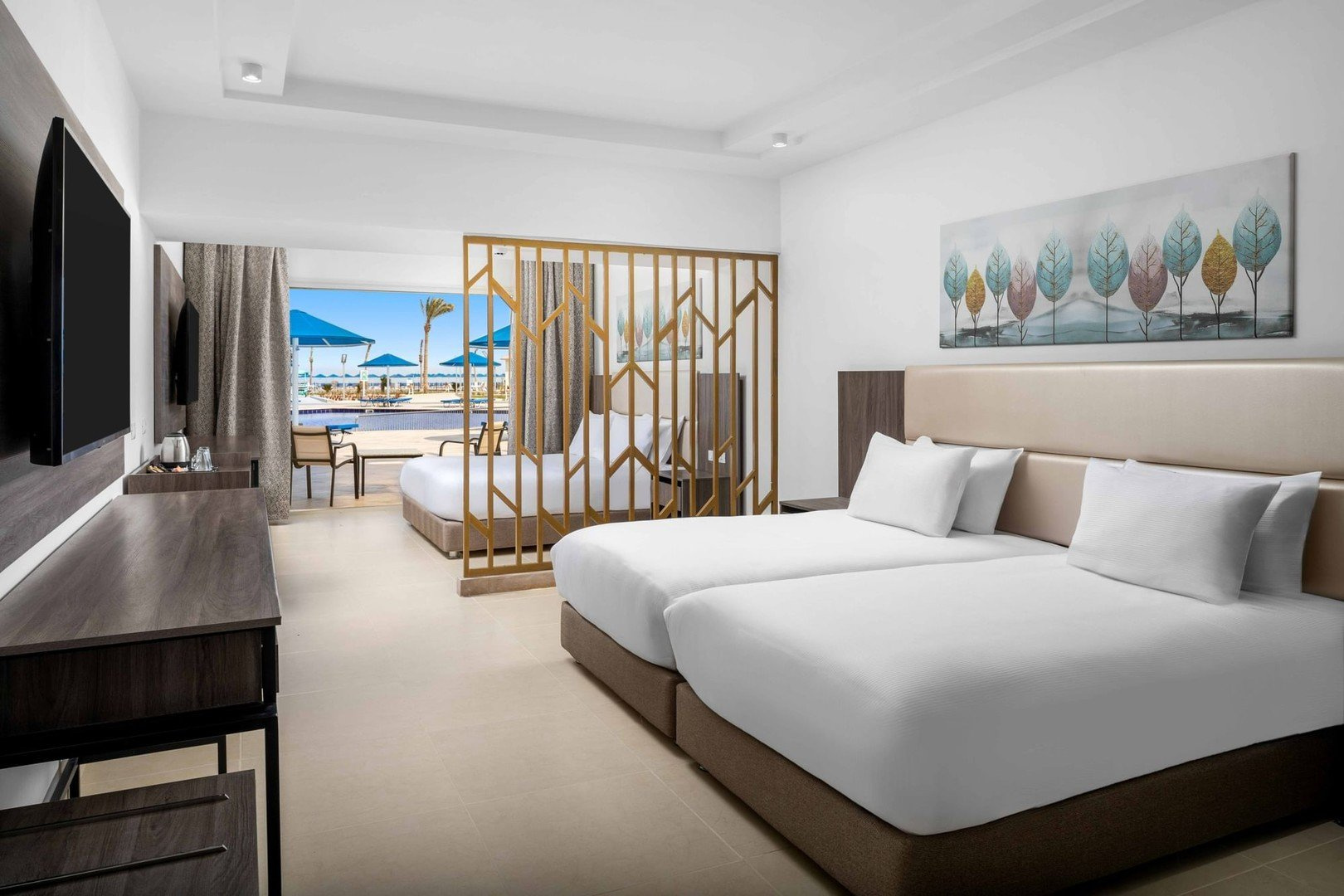 Családi szobák (egy légterű, csak optikai elválasztással) medencére néző vagy beach front kilátással, 2 felnőtt+2 gyerek részére. A szobák felszereltsége megegyezik.