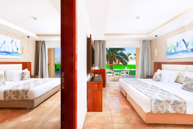 SZOBÁK: a tágas szobák zuhanyzóval, WC-vel, hajszárítóval, telefonnal, Wi-Fi-vel, műholdas TV-vel, minibárral, kávé-/teafőzővel, légkondicionálóval és erkéllyel/terasszal felszereltek. Foglalható kertre néző kilátással (DZG/TZG/EZG) vagy medencére néző kilátással (DPZ/TPZ/EPZ). Kérhető tengerre néző kilátással (DZM/TZM/EZM) is. Tapasztalja meg a luxust és a kifinomultságot a medencére néző junior suite szobában (DJP/TJP). A 65 négyzetméteres lakosztály a nyugalom oázisát kínálja és olyan kényelmi szolgáltatásokat nyújt, mint a légkondicionáló, a hajszárító, széf, vízforraló, minibár és ingyenes Wi-Fi. A kertre néző családi szobák (FZG/FG3/F4G) kb. 60 négyzetméteresek és egy részük tolóajtóval, egy részük pedig összekötő ajtóval rendelkezik.
