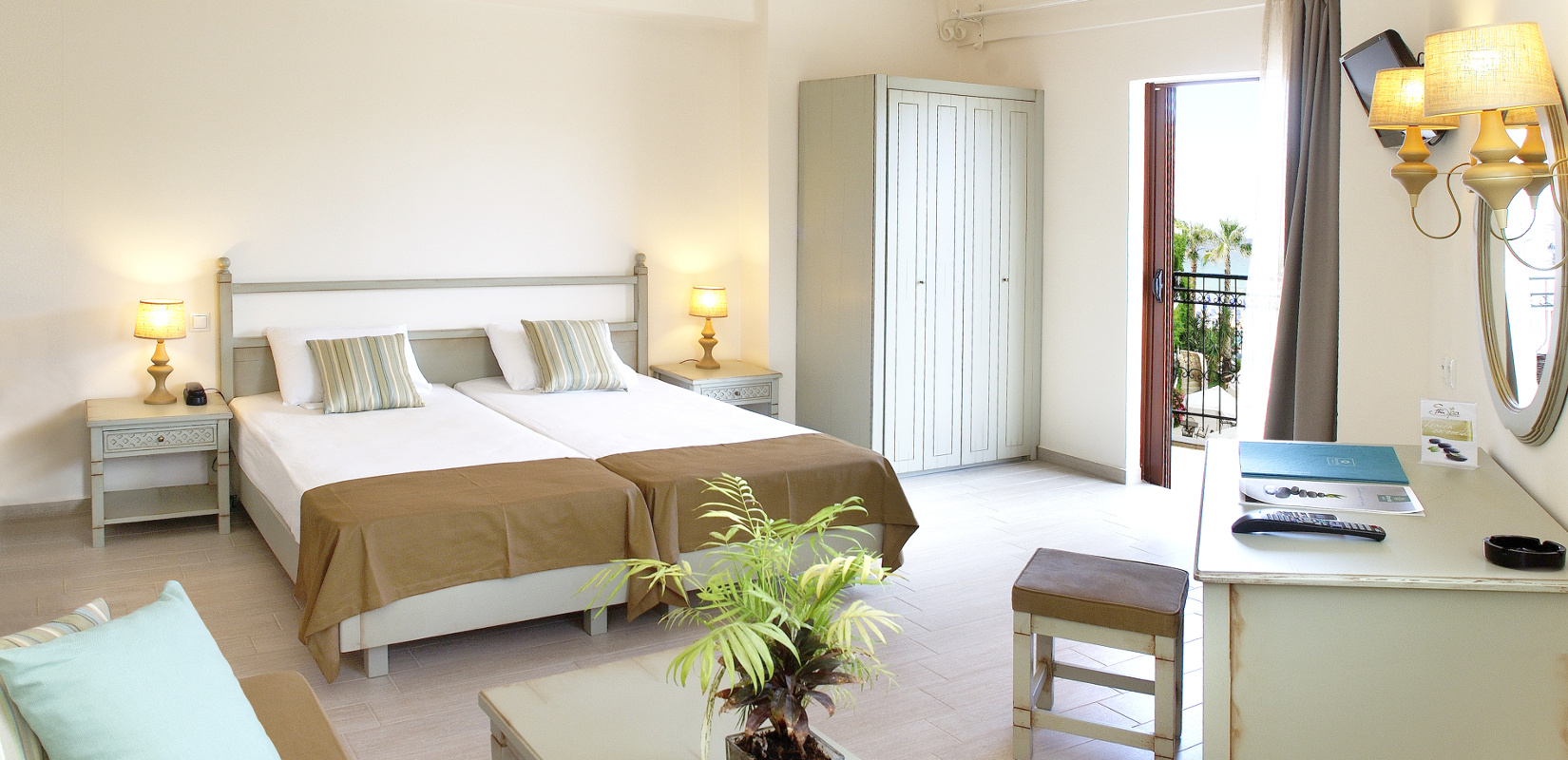 Kétágyas szoba hegyre néző kilátással / 2-3 fő: Minden szobához erkély tartozik, ahonnan csodálatos kilátás nyílik a Lefka Ori-hegységre.