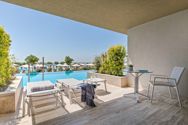 - Swim-up-családi szobák - tengerre nézők, optikailag elválasztott szoba tolóajtóval, kijárattal a külön közös medencéhez
