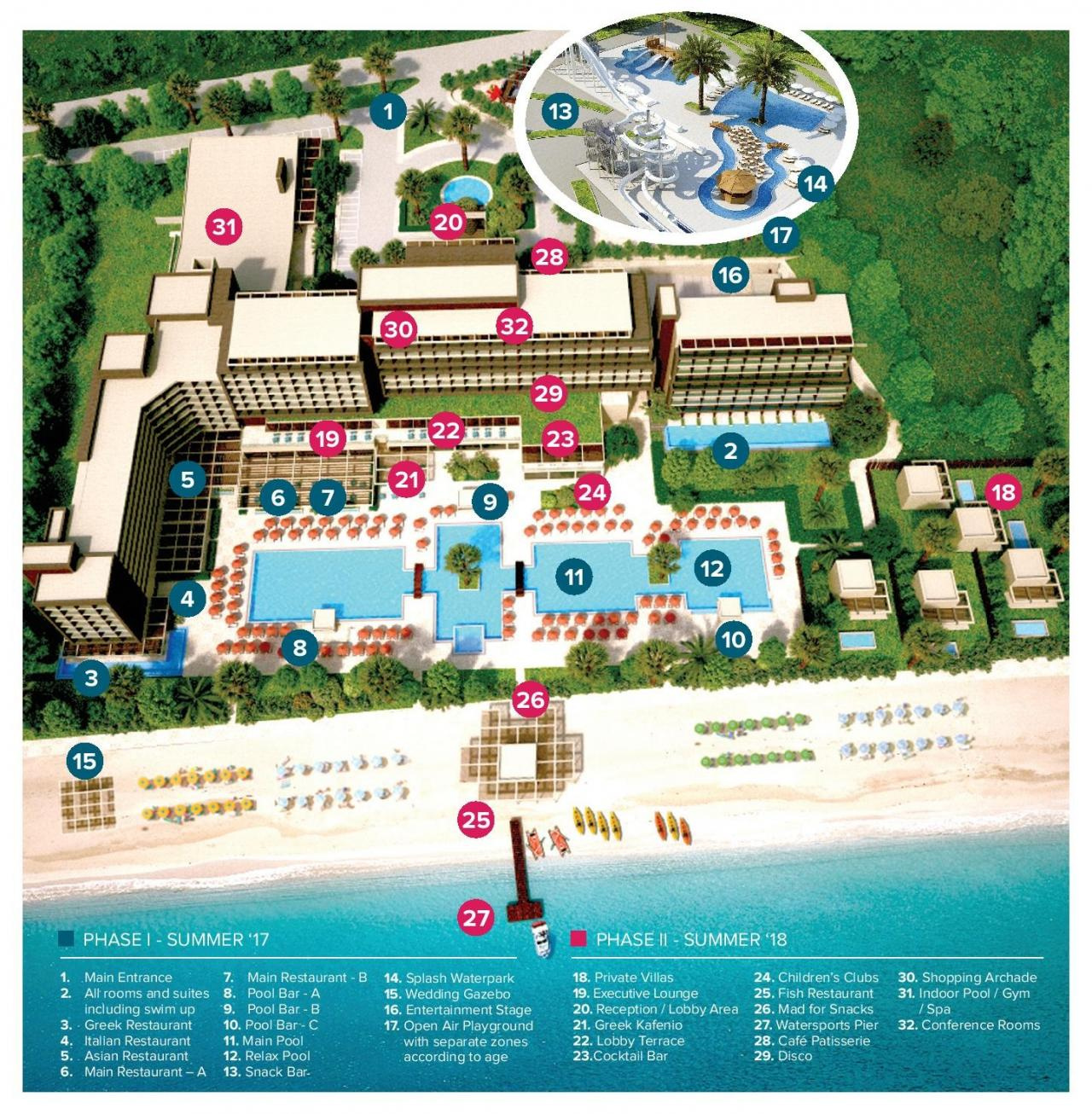 Kültéri medence, gyermekmedence, csúszdák, vízi játékok, jakuzzi, szauna, gőzfürdő, teniszpálya (letét fizetésének ellenében), strandröplabda, röplabda, íjászat, fitneszközpont várja a vendégeket. Díjfizetés ellenében a vendégek vízi sportokat is kipróbálhatnak. Zenés és táncos show műsorok, napközbeni és esti animációs programok és tematikus estek biztosítják a vendégek szórakozását. A gyermekeket bébi klub (4 hónapos kortól 2 éves korig csak szülői felügyelet mellett, 2-5 éves korig a szülői felügyelet nem kötelező), mini klub (5- 12 éves korig), tini klub (12 éves kor felett), valamint animációs programok várják.