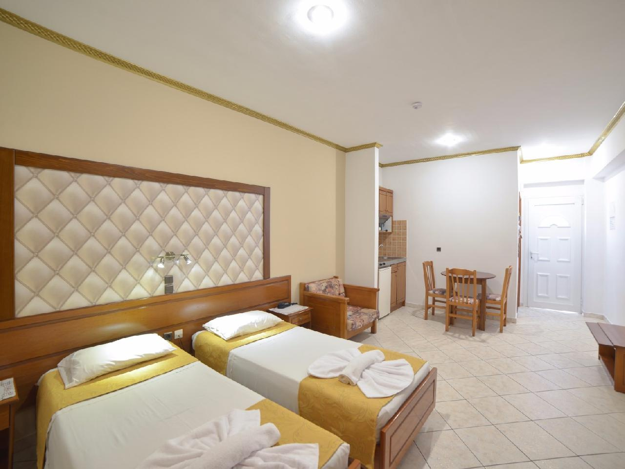 2-3 fős stúdiók, és 4 fős két hálószobás apartmannok, a földszinten, az első és a második emeleten. A legtöbbjük saját erkélyéről medencére vagy kertre nyílik a kilátás. Minden stúdióhoz és apartmanhoz saját fürdőszoba zuhanyzóval,konyhasarok, hűtőszekrény, kenyérpirító, vízforraló, műholdas TV, légkondicionálás, szobaszerviz, széf, telefon.