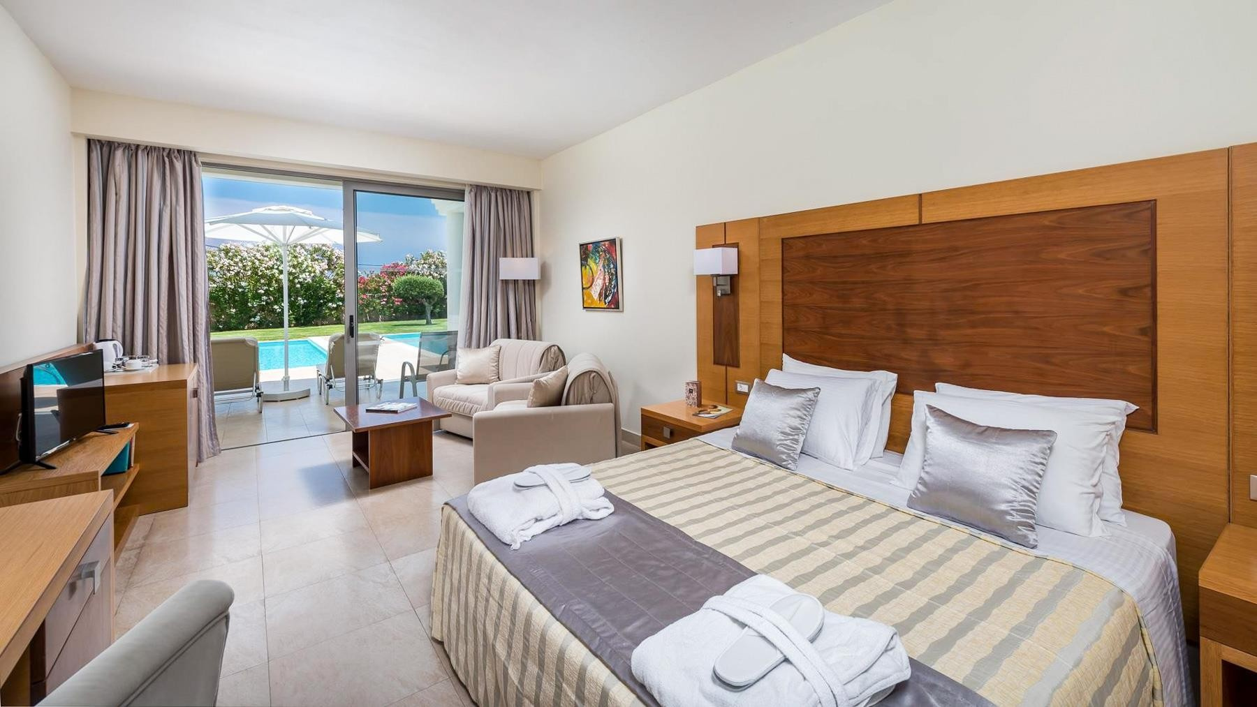 - Junior-suitek - kertre néző terasz, optikailag leválasztott nappali/hálószoba, földszintiek, privát medencével