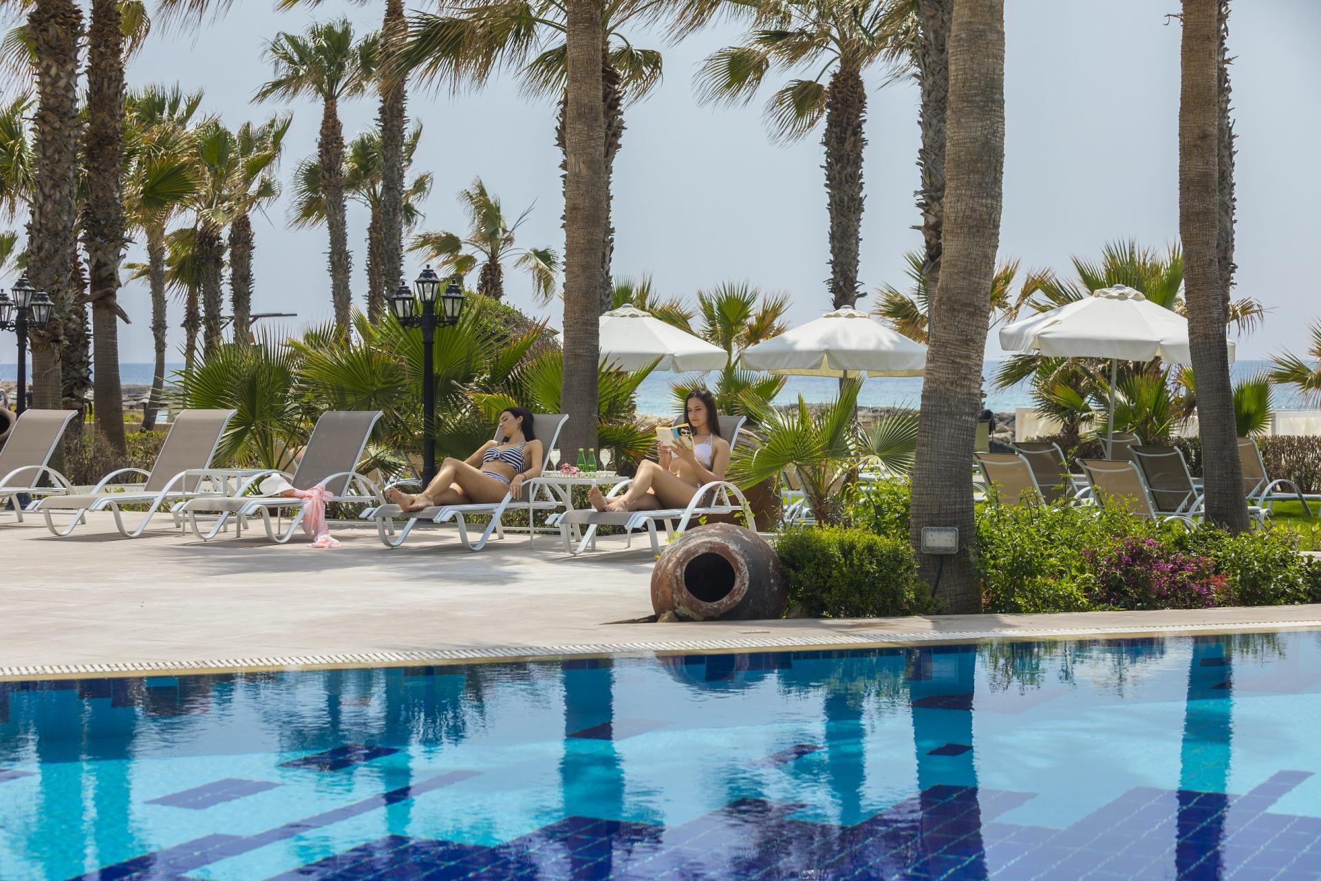 Fekvése: Paphos üdülőövezeti, Kato Paphos elnevezésű részén, közvetlenül a tengerparton, a városi leghíresebb szállodasorán található, az Ivi Mare Hotel mellett épült, szépen gondozott mediterrán pálmafás kerttel rendelkező 230 szobás hotel. A szálloda környéki partszakasz sziklás, azonban a hotel előtt egy festői kis strand található homokos parton. A szálloda előtti több kilométer hosszú sétányon akár a kikötőig is könnyedén eljuthatunk. Paphos városközpontja és a kikötő 2,5 km-re fekszik. A térség egyik legszebb strandja a Coral Bay kb. 10 km-re (taxival ~15 euró) található. Buszmegálló a szálloda közelében.