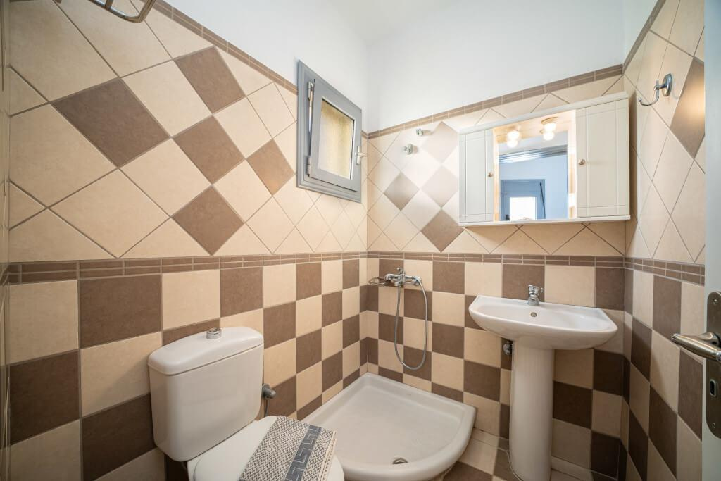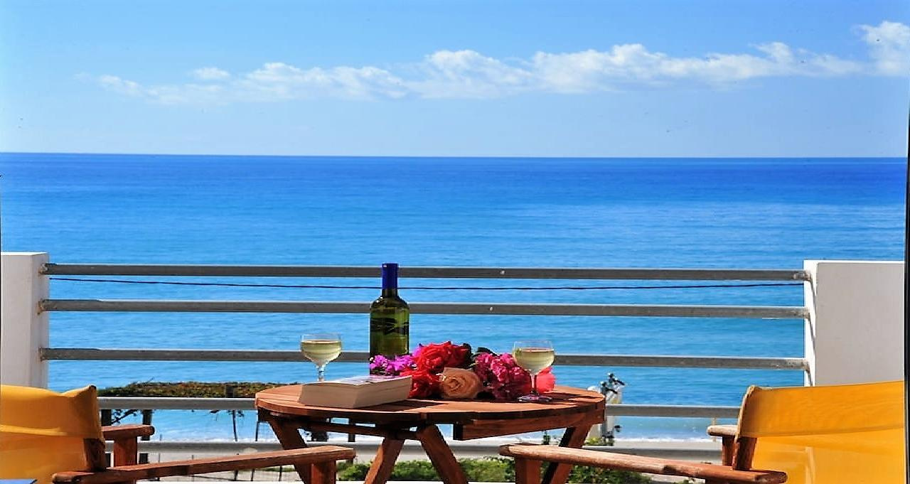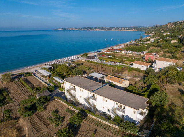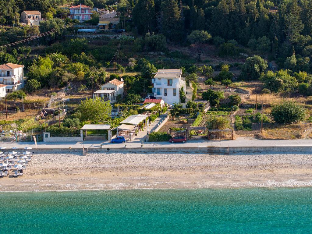 A közkedvelt apartmanház közvetlenül a fehér, finomhomokos/kavicsos tengerparton fekszik, a ház előtti terület kavicsos, a vízben már homokos. A kétszintes épület alsó szintje a ház tulajdonosának magánterülete. A házhoz tartozó kertben található a tulajdonos tavernája, ami híres a magas színvonalú, jó alapanyagokból készült ételeiről, itt reggeli, ebéd, vacsora a helyszínen kérhető. A parti sétányon tavernák, kávézók, mini szupermarket gyalogosan elérhető