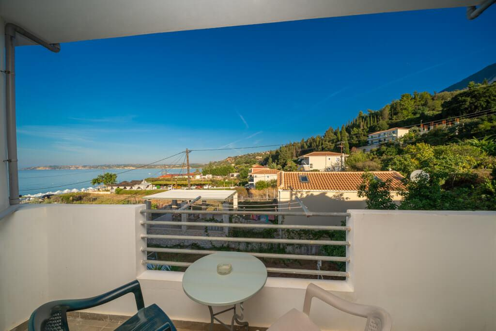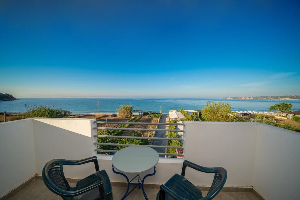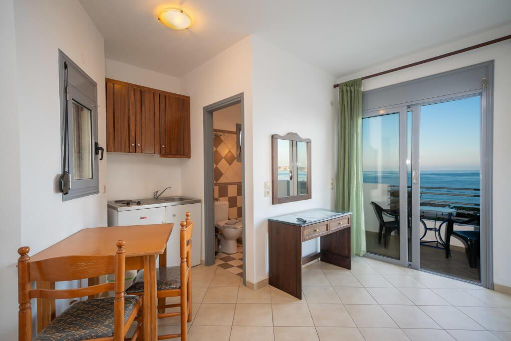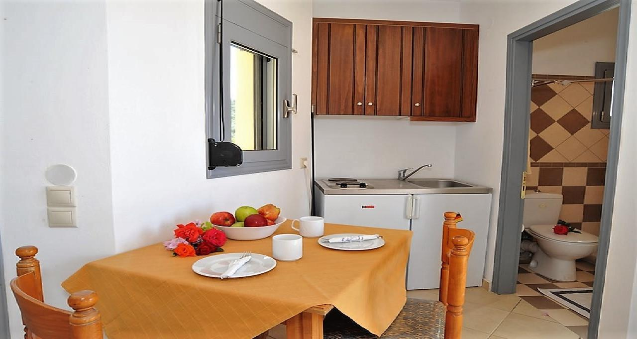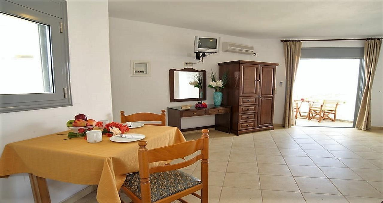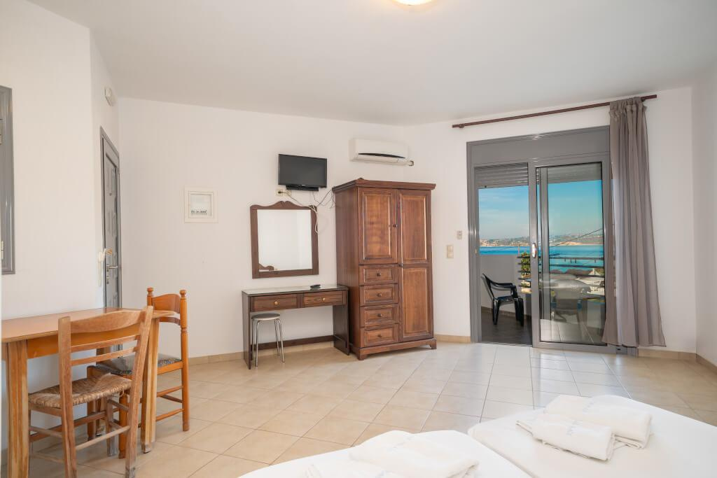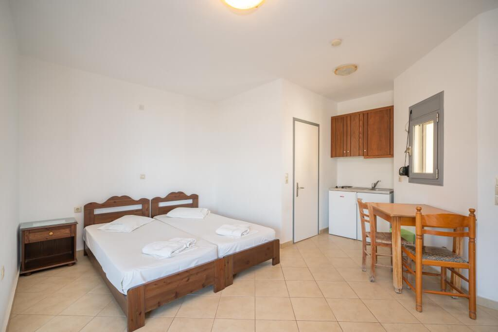 2 fős, pótágyazható, tágas stúdióban,vagy 4 fős kétlégterű apartmanokban, melyekhez fürdőszoba, saját terasz vagy balkon, tévé, széf, felszerelt konyhasarok tartozik. Minden stúdió emeleti, ahonnan csodálatos oldalról tengerre néző panoráma tárul a vendégek elé. Felár ellenében klíma kérhető.