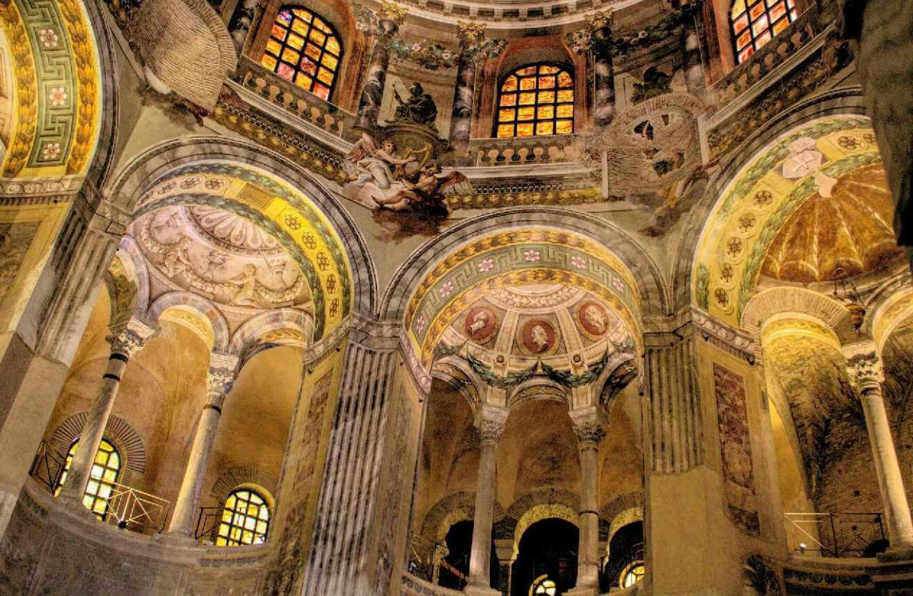 Ravenna nem csak a Nyugat-Római birodalom végén, hanem a gótok uralkodása alatt és a bizánci uralom idején is főváros volt, így ezekből az időkből (402-751 között) számtalan építészeti örökség maradt fenn, ezek közül nyolc (!) műemléke az UNESCO Világörökség része. Két dolog kapcsolódik szorosan a városhoz: a színes és mozgalmas bizánci mozaikok és a híres költő, Dante Alighieri, aki élete utolsó éveit Ravennában töltötte és akit itt is temettek el. A Basilica di San Vitale és a Galla Placida mauzóleum mozaikjait közelebbről is megcsodálhatjuk. Az aprólékos részletek, a ruhák és ékszerek gazdagsága, és a díszítő elemek minősége mind-mind a bizánci udvar pompájára utalnak. A beszűrődő fény a márványfelületeken és a mozaikokon rendkívül szuggesztív hatású, a kupolában látható csillagos égbolt pedig számos művésznek adott ihletet.