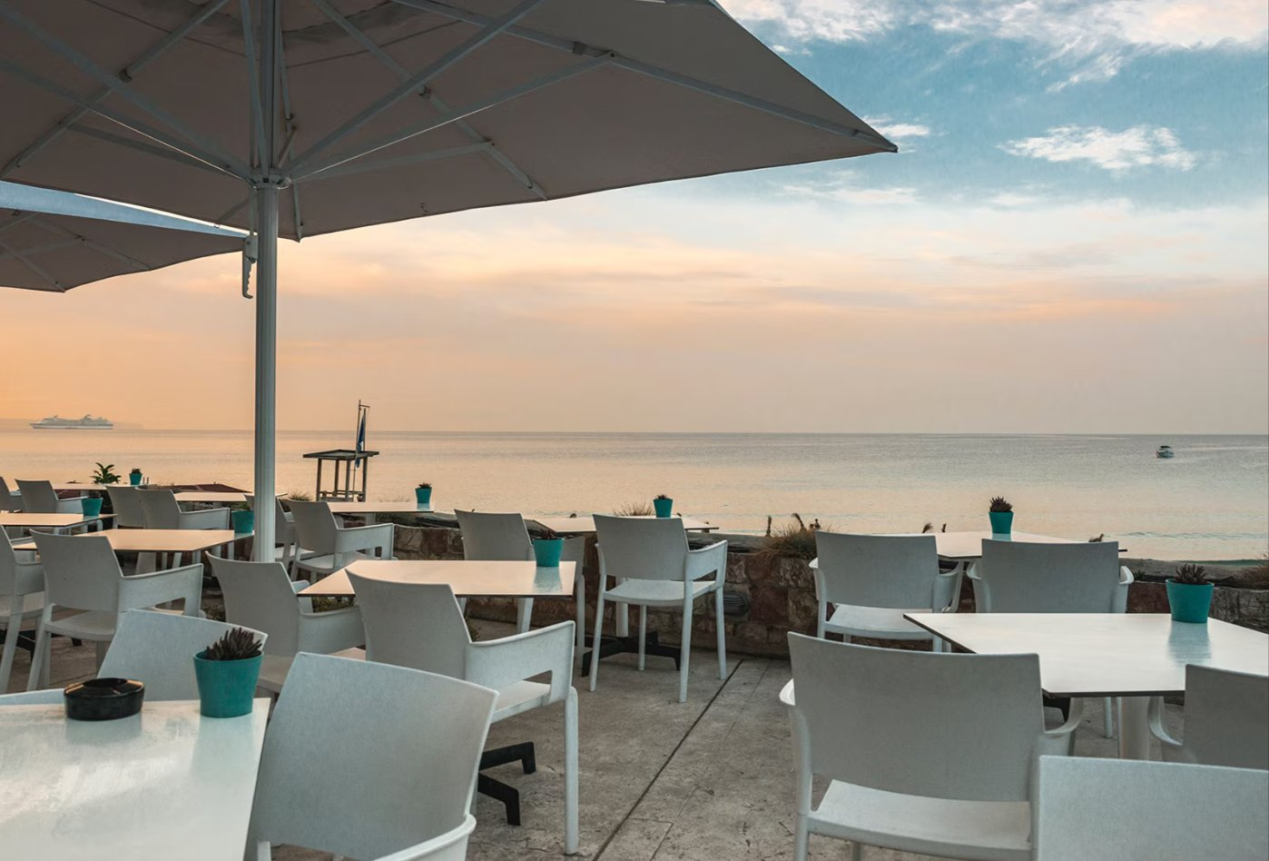 Modern, elegáns enteriőr, tengerre néző szobák és hangulatos napozóterasz.