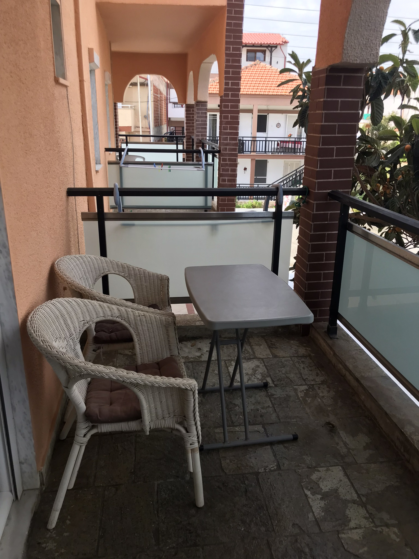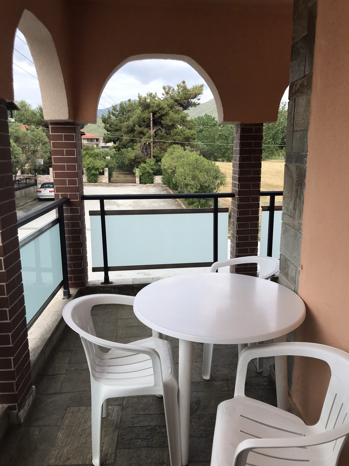 Fekvése: Az apartmanház Sarti új részén (Village) fekszik, kb. 70 méterre a homokos-aprókavicsos tengerparttól és kb. 500 méterre a központtól. A közelben éttermek, tavernák és pékség is található, ahol a híres „Liturgia” nevű kenyér is kapható. Szolgáltatások: A ház földszinti, hűvös teraszán asztalok és székek szolgálják az itt üdülő utasok pihenését, kényelmét. Parkolás az utcán, az apartman előtt megoldható, a WIFI térítésmentesen vehető igénybe. Elhelyezés: 2-3 ágyas stúdiók: az apartmanház 1. emeletén helyezkednek el, a szobákban a konyhasarok a hálótérrel egy légtérben található. A 3.fő részére a pótágy normál ágy. A stúdiókban légkondicionáló (felár a helyszínen fizetendő, 35 EUR/készülék/hét), sat-tévé, konyhasarok a legszükségesebb eszközökkel felszerelve, fürdőszoba zuhanyzóval, kerti bútorokkal berendezett balkon vagy terasz található. Személyenként 2 db törölköző biztosított, amelyek a strandra nem vihető le. Ellátás: Önellátás. (Vacsora ill. félpanzió felár ellenében kérhető.)Egyéb: