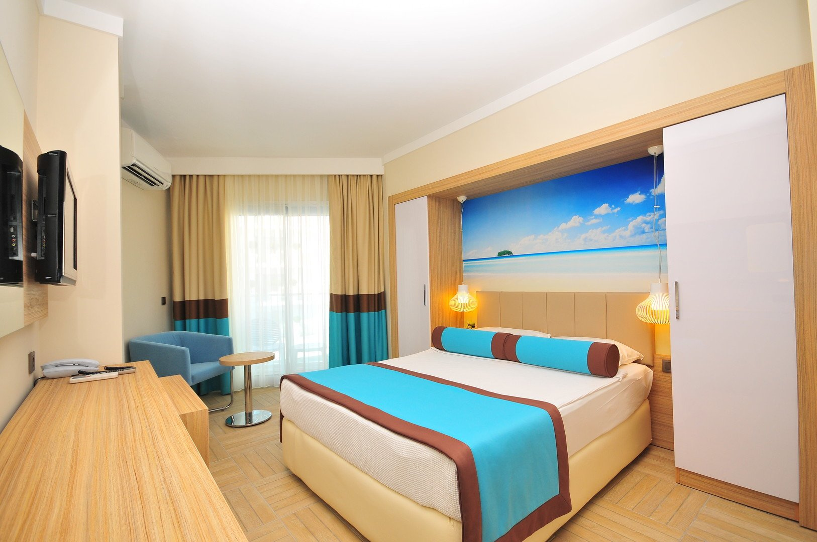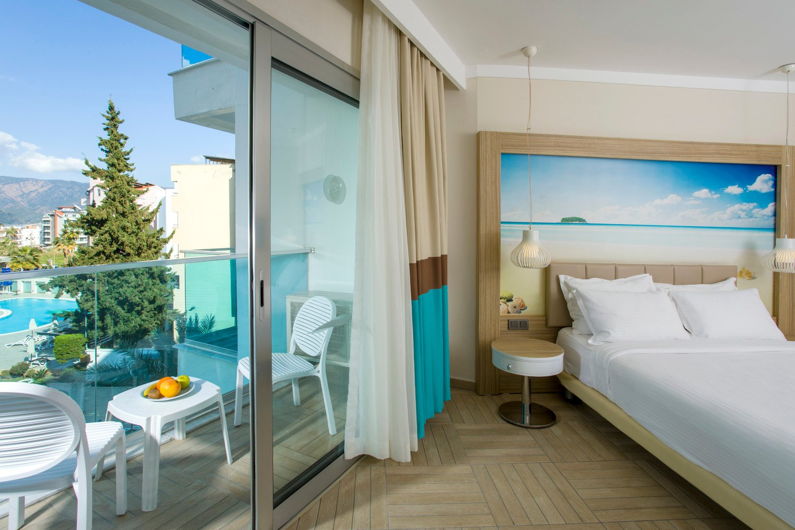 A szállodától körülbelül 250 méterre található a nyilvános, homokos-kavicsos partszakasz, amelyen külön rész áll a szálloda vendégeinek rendelkezésére. A napernyők és napozóágyak ingyenesen vehetők igénybe, a strandon pedig bárok (külső szolgáltatók által üzemeltetve) gondoskodnak a frissítő italokról és harapnivalókról.