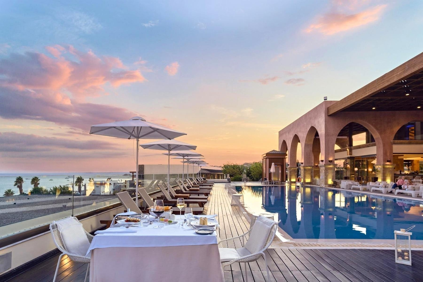 - Junior-suitek - tágasabbak, terasz, saját medence, napozóágyak a teraszon, oldalról tengerre nézők
