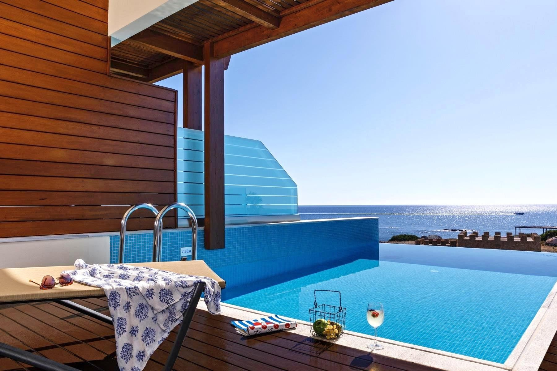 - Superior Junior-suitek - tágasabbak, terasz, saját medence, napozóágyak a teraszon, részben tengerre nézők