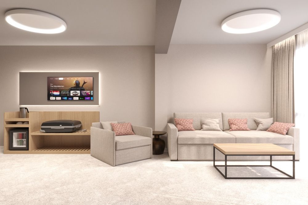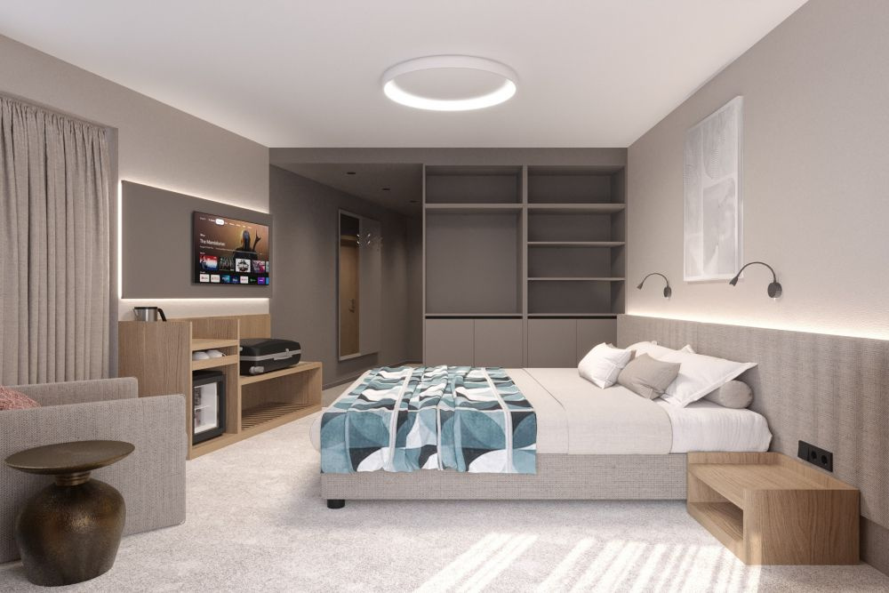 • 1 hálószobás apartmanok (max. 2+3 fő, kb.35 m²): nappali kihúzható kanapéval és egy külön hálószoba franciaággyal; ajtó a szobák között