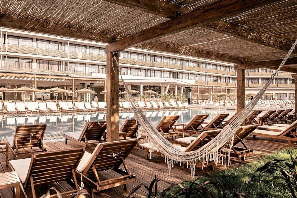 kültéri medencék napernyőkkel és napozóágyakkal