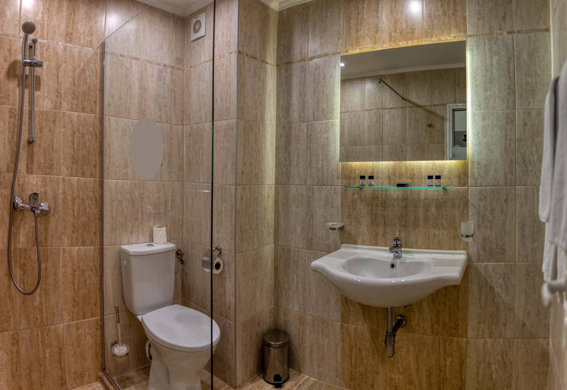 • Zuhanyzós fürdőszoba - hajszárító, piperecikkek, kozmetikai tükör.