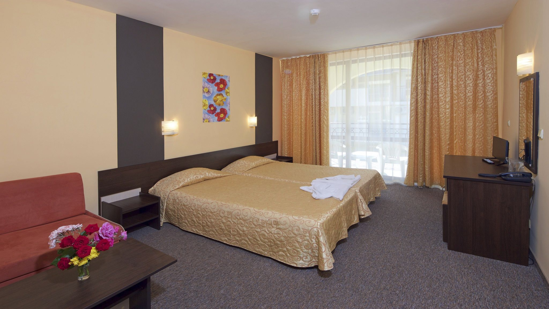 - Hotel Yavor Palace**** Napospart központi részén, a parttól kb. 200 méterre található. A 200 szobás szálloda csendesebb környezetben, de a központi sétánytól csak egy utcányira helyezkedik el. A standard és a medencére néző kétágyas szobák, 2 felnőtt mellett akár 2 gyermek részére is pótágyazhatóak.