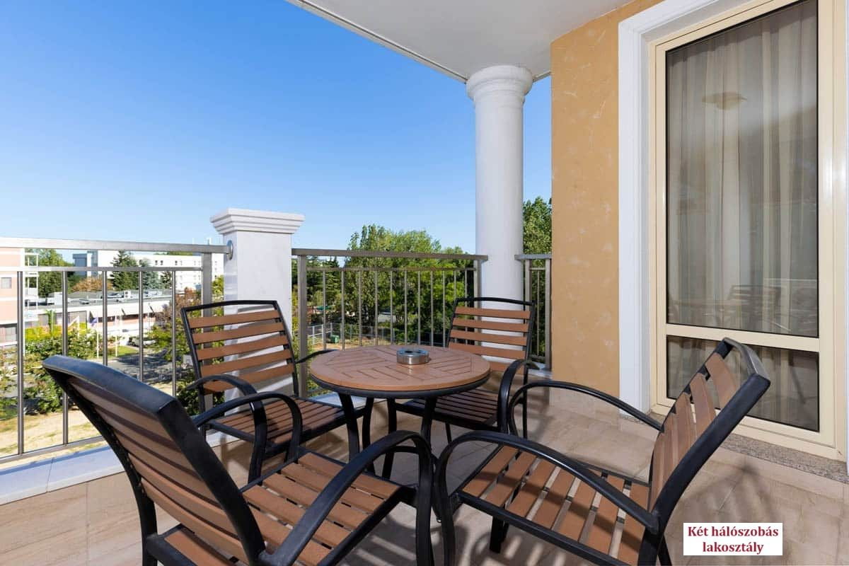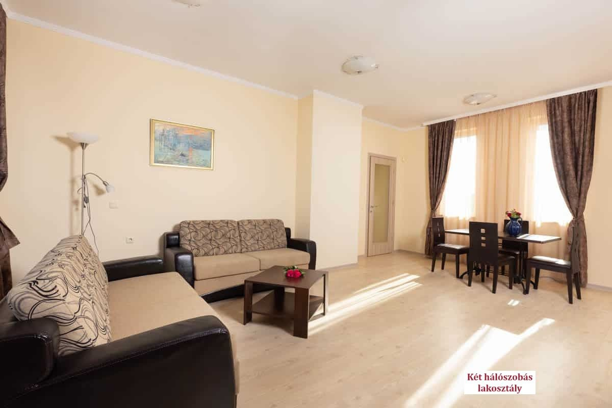 - Két hálószobás lakosztály (APT 2 bedroom): 85-90 m², nappali és két hálószoba 2-2 egyszemélyes ággyal. Maximum 6 fő elszállásolására alkalmas.
