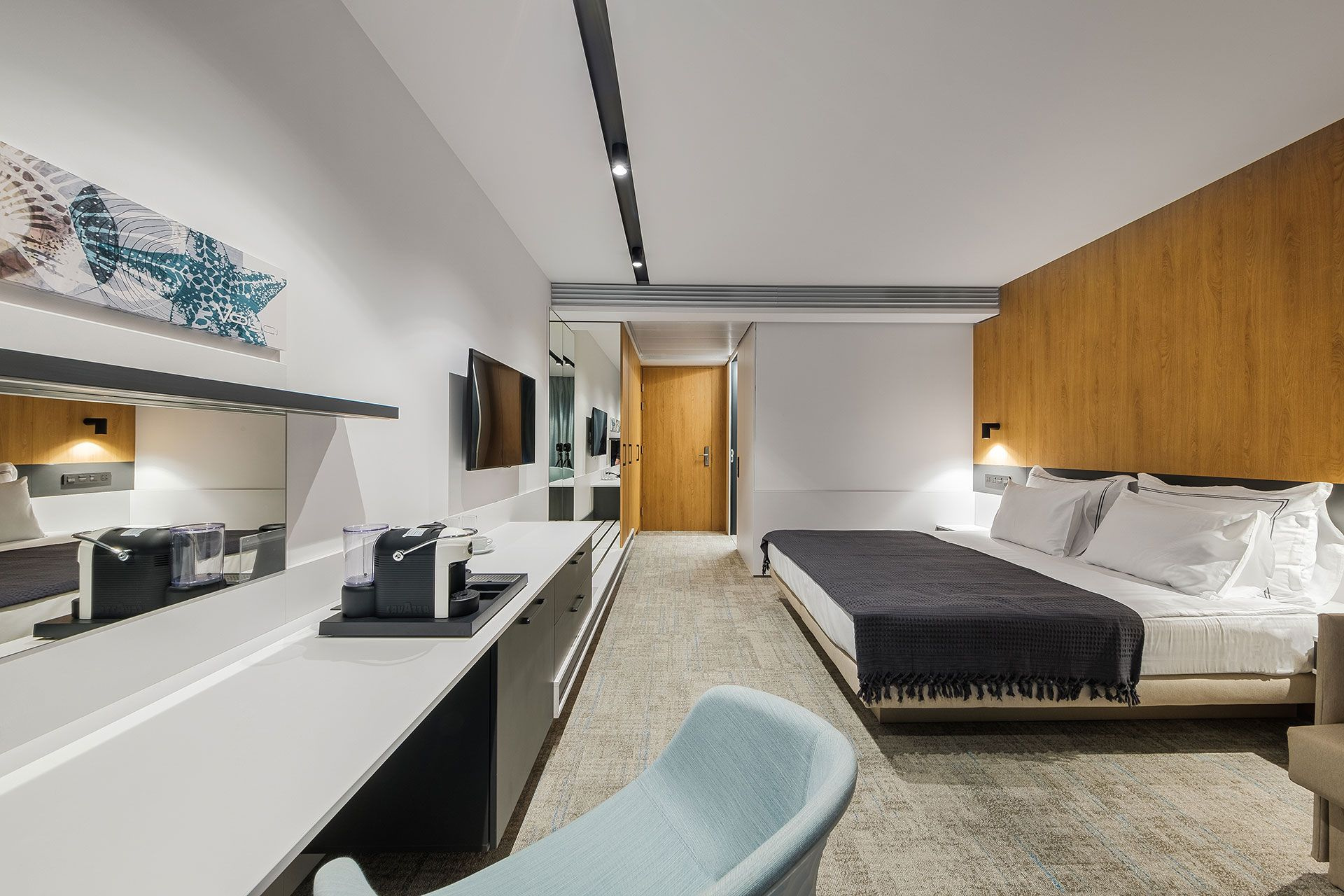 - Egy hálószobás apartman (one bedroom apartment) - tengerre néző: kb. 50 m2, hálószoba king size franciaággyal (180×200cm), nappali 2 kanapéval (90x190 cm), 2 fürdőszoba. Max. 4 felnőtt +1 csecsemő részére