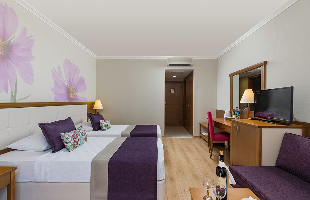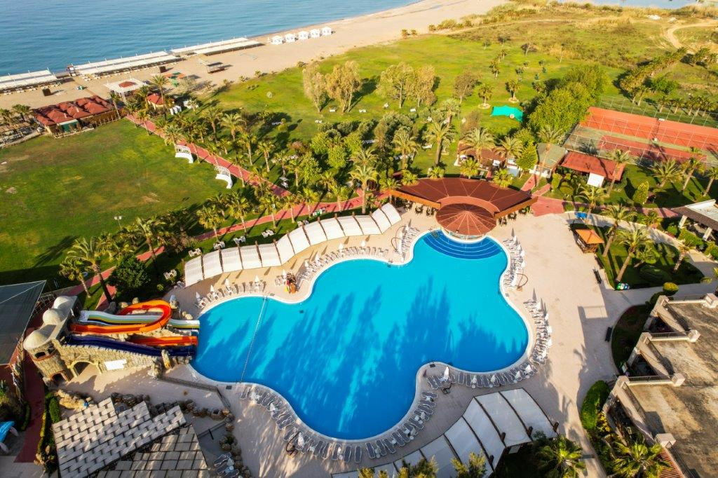 Fekvése: A kiváló minőségű, családbarát, 15 db kétszintes épületől álló szállodakomplexum 85 km-re fekszik az antalyai repülőtértől, 14 km-re Manavgat és 19 km-re Side központjától, ahova helyi járatú busszal (dolmus) vagy taxival is eljuthatunk. A szálloda közvetlen a homokos, aprókavicsos strand mentén helyezkedik el. Nyaralásunk során mindenképpen érdemes elmerülnünk a bazárok széleskörű kínálatában, felfedezhetjük Side antik romvárosát, vagy csak élvezzük a szálloda számtalan szolgáltatását! Szolgáltatások: Felnőtt és gyermekmedence napozóágyakkal és napernyőkkel, relax medence, beltéri medence (csak a téli szezonban üzemel), nappali és esti animációs programok, showműsorok, élő zene bizonyos napokon, miniklub (4-12 éveseknek), junior klub (13-16 éveseknek), játszótér, török fürdő, szauna, fitnesz terem, teniszpálya használat, strandröplabda, íjászat, darts, aerobik, vízi torna, vízi labda, asztalitenisz, WiFi elérhetőség. Napozóágyak, napernyők és strandtörölközők a strandon díjmentesen használhatók. Térítés ellenében: Spa részleg kezelései, masszázsok, fodrászat, üzletek, mosoda, orvosi szolgálat, teniszpálya világítás és felszerelés, vízi sportok a strandon. Elhelyezés: A 240 kényelmes szoba mindegyike rendelkezik egyénileg szabályozható légkondicionálóval, SAT-TV-vel, telefonnal, széffel, vízforralóval, minibárral és hajszárítóval. A standard szobák 25-28 nm-esek, max. 3 felnőtt vagy 2 felnőtt + 2 gyermek részére foglalhatók. a Junior családi szobák 30-33 nm-esek, 2 szobások, az egyik szoba franciaággyal, a másik emeletes ággyal felszerelt. A nagyméretű családi szobák 35-38 nm-esek, 2 szobások, az egyik szobában franciaággyal, a másikban két külön ággyal felszereltek. Ellátás: All Inclusive: Reggeli, ebéd és vacsora büférendszerben, késői reggeli, éjféli snackek (23:00-24:00), gözleme bizonyos időpontokban, kávé/tea/sütemények, helyi alkoholos és alkoholmentes italok (10:00-24:00), minibár érkezéskor vízzel, üdítővel és sörrel feltöltve, fogyasztás az a’la carte étteremben (olasz és hal, a tartózkodás során egy alkalommal, előzetes asztalfoglalással). Térítés ellenében: Import és üveges italok, egyéb fogyasztás.Egyéb: