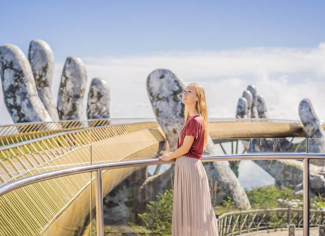 Az út során megcsodálhatjuk a régi francia villákat, átkelünk egy látványos függőhídon, majd feljutunk a Nui Chua hegycsúcsára (1 487 méter magasságba). A program során felkeressük a Linh Ung Pagoda templomot, a híres "Arany hidat"- melyet a sziklából kiemelkedő két hatalmas kéz tart a magasba -, valamint Sákjamuni Buddha monumentális szobrát. Ebéd útközben.