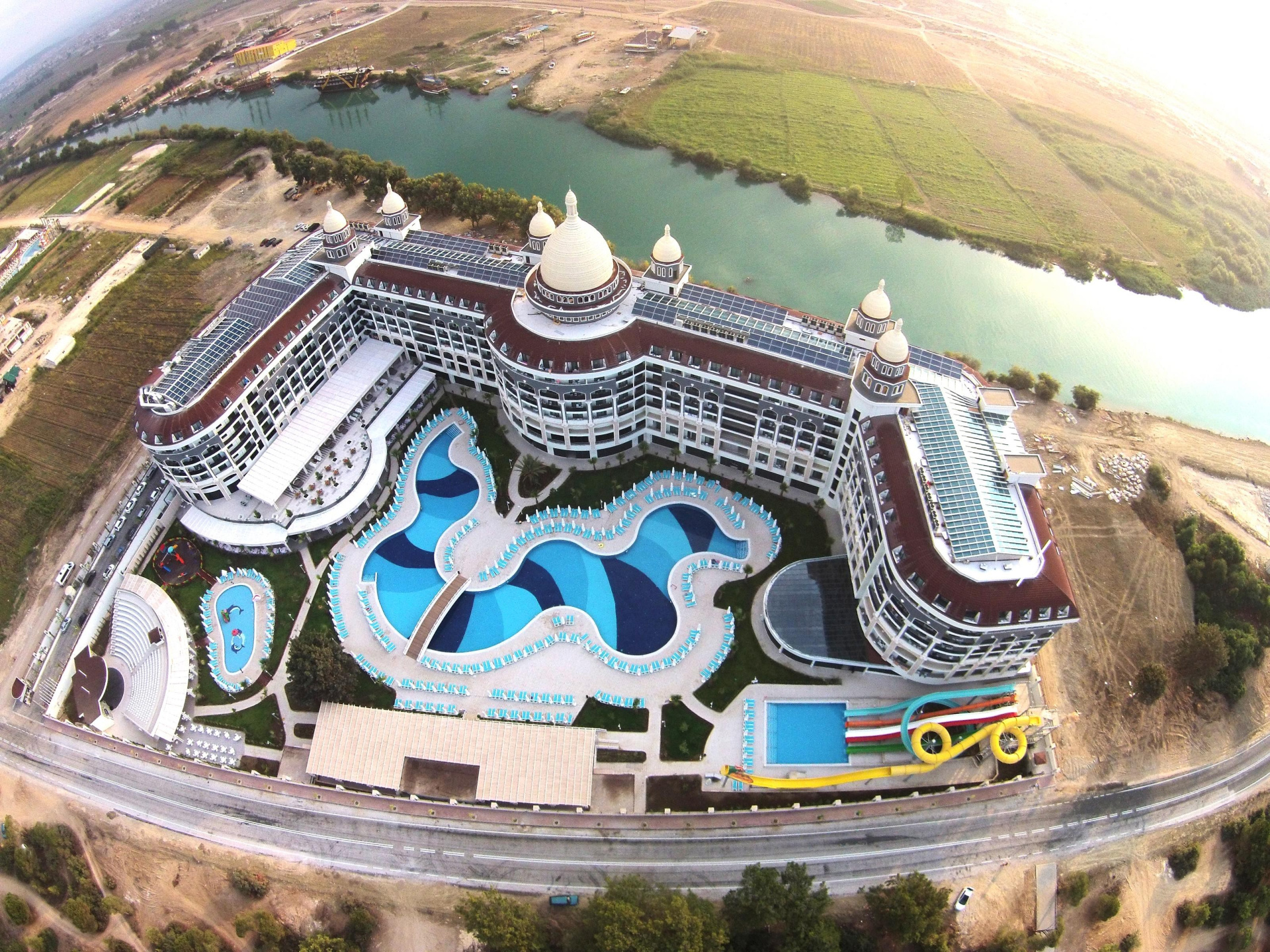 - több medence (az egyik csúszdákkal), napozóterasz ingyenes napágyakkal és napernyőkkel, törölközők kaució ellenében