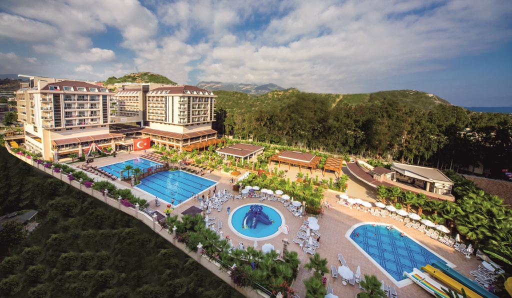 Fekvése: A 2013-ban megnyílt, modern, közkedvelt (HELYI BESOROLÁS SZERINT) 5 csillagos szálloda Alanya központjától 12 km-re, Konakli üdülőváros központjától mindössze 2 km-re, az antalyai repülőtértől pedig 120 km-re található. A hotel 200 méterre helyezkedik el saját, homokos-kavicsos strandjától, mely egy rövid sétával könnyedén megközelíthető; a tengerben kövek és sziklák előfordulhatnak, így fürdőcipő használatát javasoljuk. Alanyába helyi buszjárattal (dolmussal) vagy taxival könnyedén bejuthatunk. Érdemes legalább egyszer ellátogatni a városba, ahol elvegyülhetünk a bazári forgatagban, vagy felsétálhatunk a pompás panorámájú várba. Alanya kikötőjében számos szórakozási lehetőség közül is választhatunk, bárok, éttermek és diszkók várják a turistákat. Szolgáltatások: 2 medence napernyőkkel és napozóágyakkal, gyermekmedence, 3 csúszda, belső medence gyermekrésszel, főétterem, 2 a’la carte étterem, 4 bár, cukrászda, nappali és esti animációs programok, miniklub (4-12 éves korig), játszótér, minidiszkó, fitneszterem, törökfürdő, szauna, asztalitenisz, darts, strandröplabda, aerobik, step, vízitorna, medencejátékok, WIFI. A szálloda saját, homokos-kavicsos strandján a napernyők, a napozóágyak és a strandtörölközők ingyenesen használhatók. Térítés ellenében: törökfürdő kezelései, masszázs, jakuzzi, fodrászat, játékterem, biliárd, léghoki, vízi sportok, üzletek, mosoda, orvosi ellátás, internetkávézó, konferenciaterem. Elhelyezés: A szálloda 250 szobájának mindegyike rendelkezik központi légkondicionálóval, hajszárítóval, telefonnal, műholdas LCD tévével, széffel, minibárral, WIFI internetkapcsolattal és erkéllyel. A családi szobák két, ajtóval elválasztott hálószobával rendelkeznek; az egyikben franciaágy, a másikban két egyszemélyes ágy található. Ellátás: Ultra All inclusive: reggeli, ebéd és vacsora büférendszerben, kései reggeli, napközben sütemények, délutáni snackek, délutáni kávé/tea, gofri és fagylalt (bizonyos időpontban), éjféli leves, éjszakai minibüfé (23:00-06:00 között), meghatározott helyi és bizonyos alkoholos és alkoholmentes italok (10:00-02:00 között), minibár (csak érkezéskor üdítőkkel és vízzel, majd naponta csak vízzel feltöltve). Térítés ellenében: bizonyos import italok, palackozott italok, frissen facsart gyümölcslevek, 2 a’la carte étterem (mediterrán és török, előzetes foglalással), szobaszerviz, további minibár fogyasztás.Egyéb: