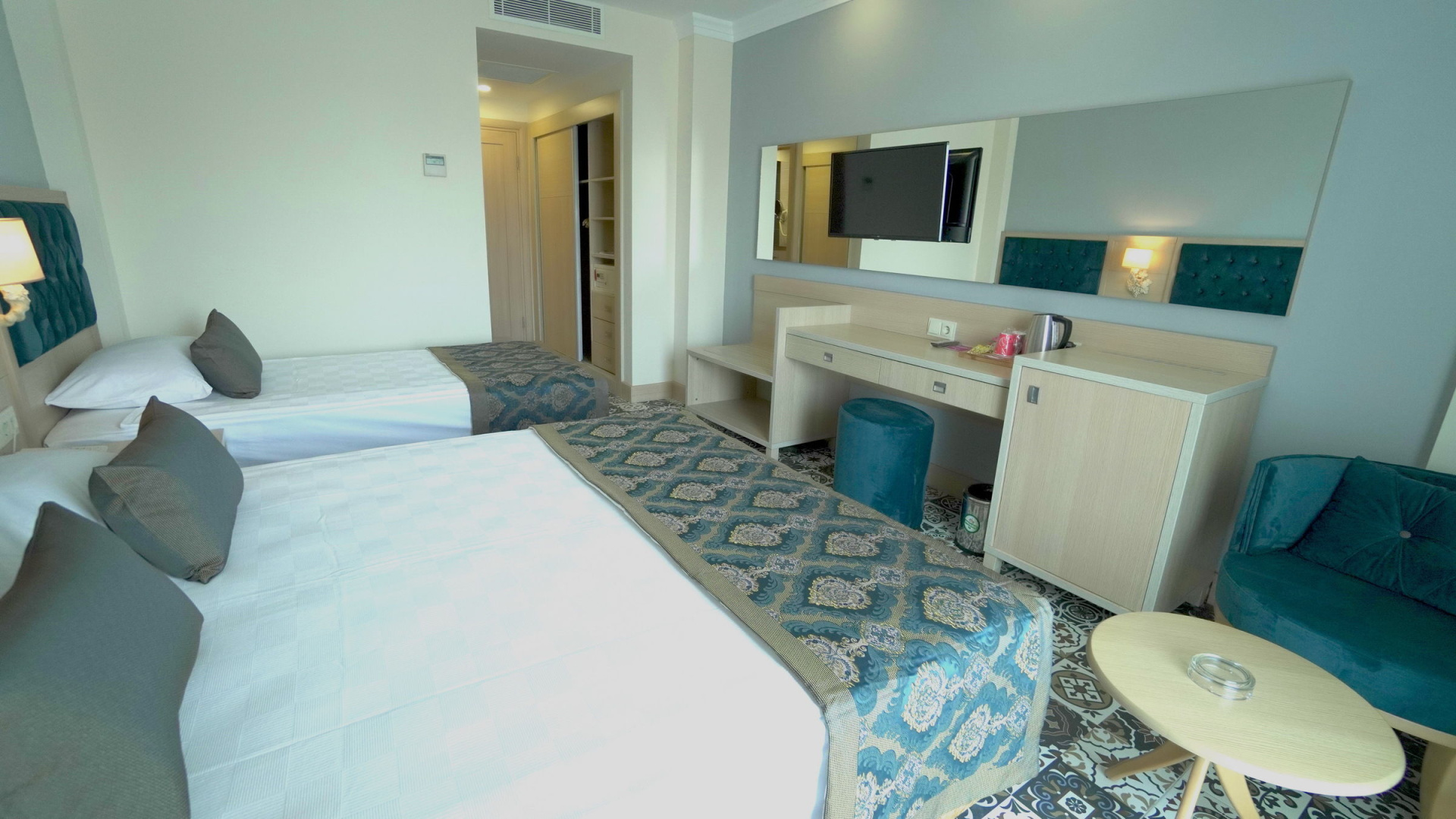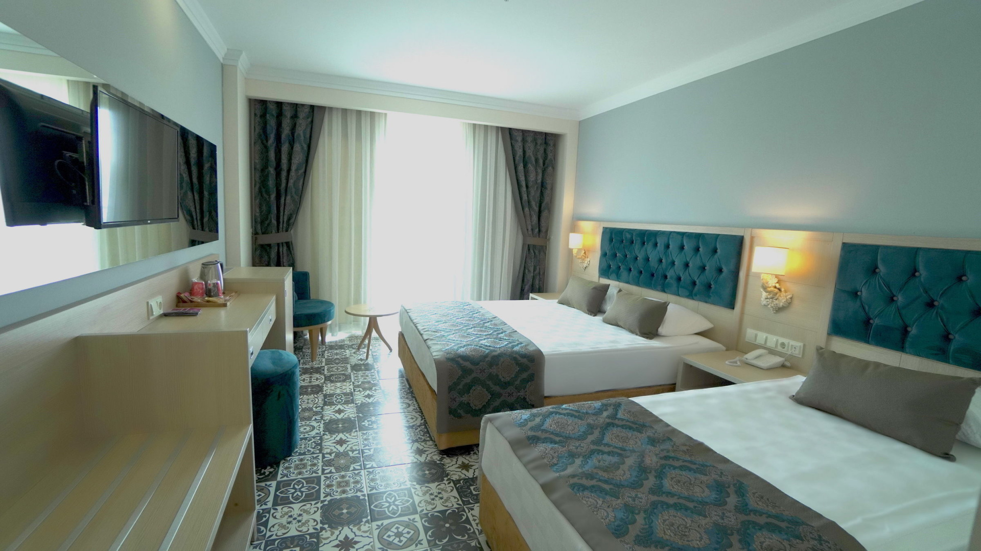 A szobákat légkondicionáló berendezéssel, központi fűtéssel és fürdőszobával szerelték fel. A vendégek a teraszon, illetve az erkélyen is kényelembe helyezhetik magukat. A szobák egy franciággyal és egy kihúzható kanapéval rendelkeznek. Különálló hálószobák foglalására is lehetőség van. Kiságyat és pótágyat tudnak biztosítani. Egy minibár, valamint díj fizetése esetén egy széf is rendelkezésre áll. A kényelmet szolgálja továbbá egy minihűtő és egy tea-/kávéfőző. A nyaralás kényelmét szolgálja az internet-hozzáférés, a telefon, a TV-készülék és WiFi. A szobákban szobapapucs is található. Mozgáskorlátozottaknak kialakított szobák is foglalhatóak. A fürdőszobában zuhanyzó található. A fürdőszobában található hajszárító, kozmetikai tükör, fürdőköpenyek és telefon a mindennapi kényelmet szolgálják. Különlegesség, hogy a vendégek a fürdőszobákban kozmetikai cikkeket is találnak. Családi szobát és nem dohányzó szobát is foglalható.