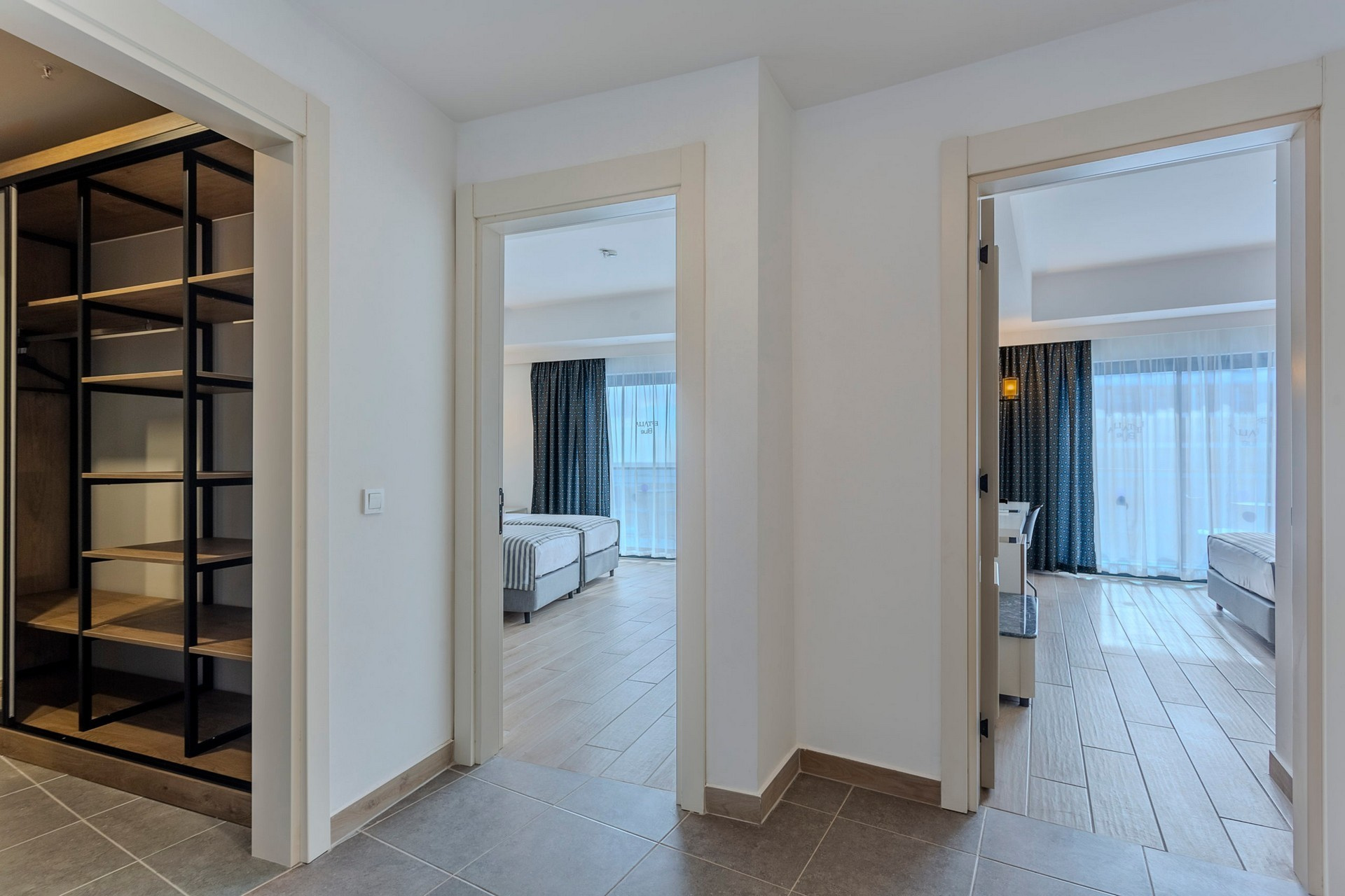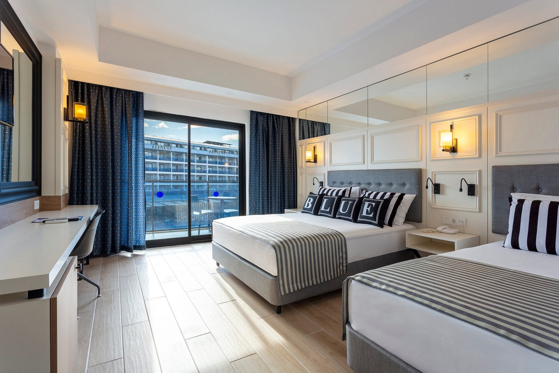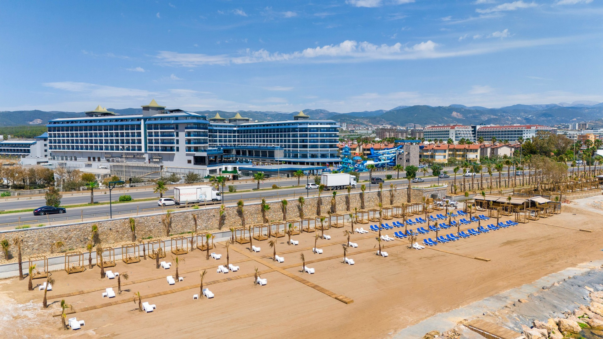 - Eftalia Island: homokos strand kavicsokkal, kb. 500 m-re a hoteltől, vízi parkok, medencék és bárok az UAI keretében (alkoholmentes italok, sör és harapnivalók – egyes bárok és attrakciók felár ellenében vehetők igénybe) – itt napozóágyak és napernyők ingyenesek, törölközők ingyenesek (visszatérítendő kaució ellenében).
