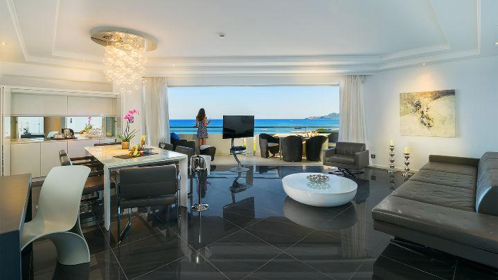 2 alapterületű, tengerre néző junior lakosztály, mely tolóajtóval elválasztott nappali-résszel és két fürdőszobával rendelkezik.