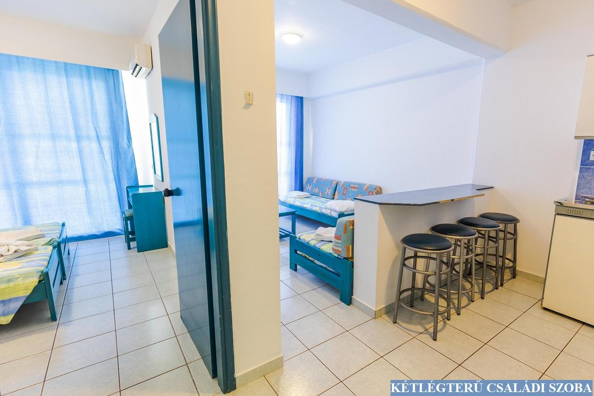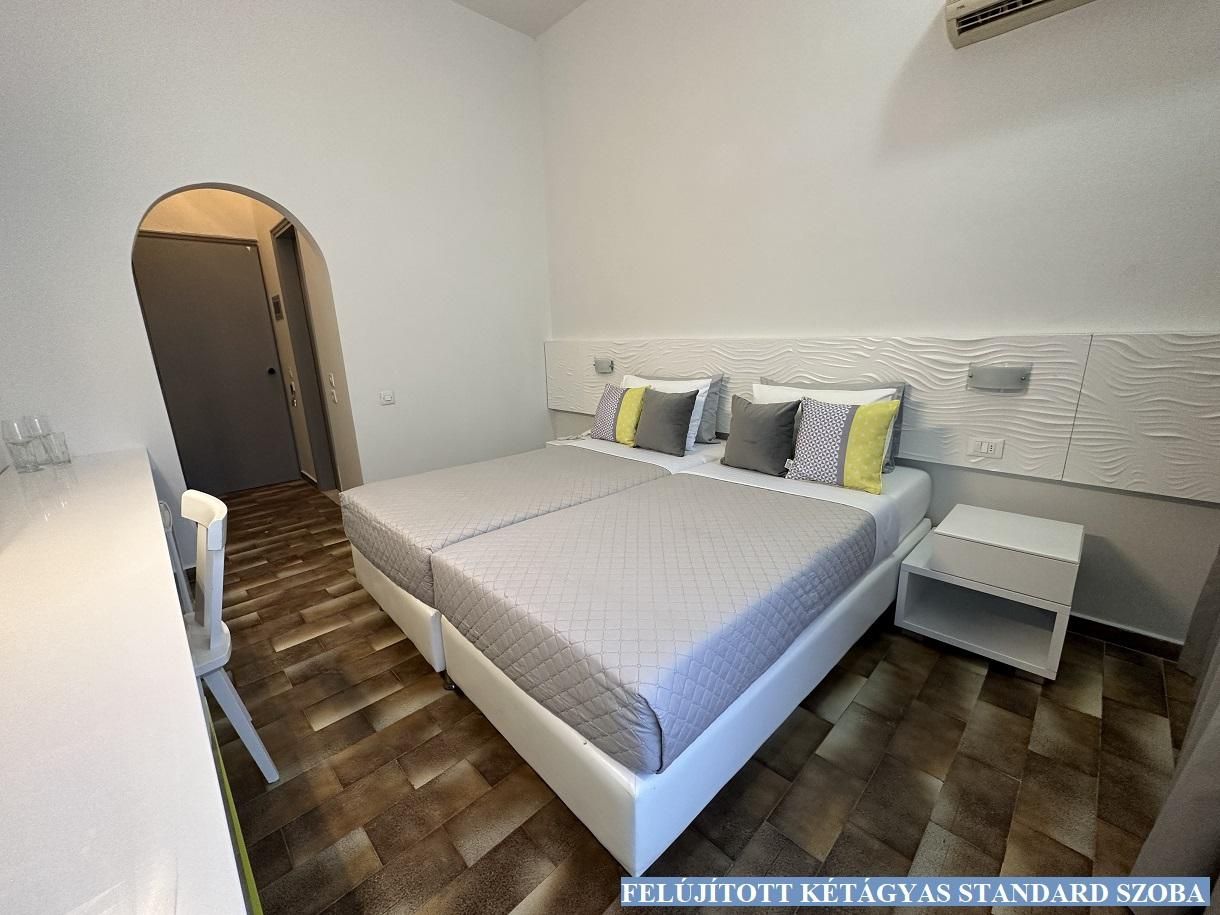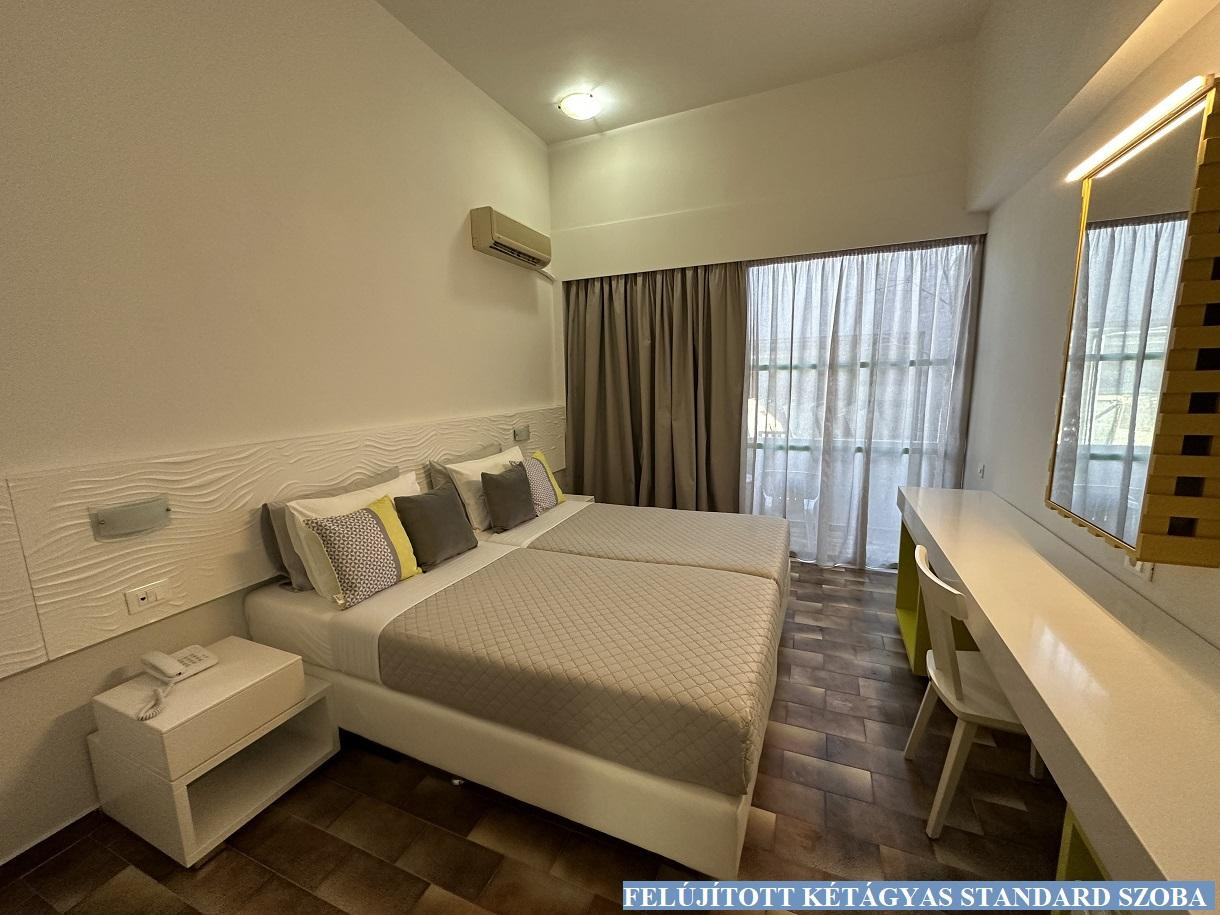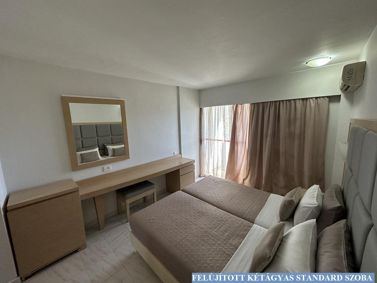 Szobák: Az Evi szálloda összesen 240 szobával és 34 apartmannal rendelkezik. A hotel minden szobája légkondicionált, telefonnal, rádióval felszerelt. Az apartmanok mindegyike két szobás, konyhasarokkal, hűtőszekrénnyel, légkondicionálóval felszerelt. A négyágyas szoba egylégterű standard szoba 2 ággyal és 2 pótággyal. A szobák egy részéhez erkély vagy terasz tartozik.