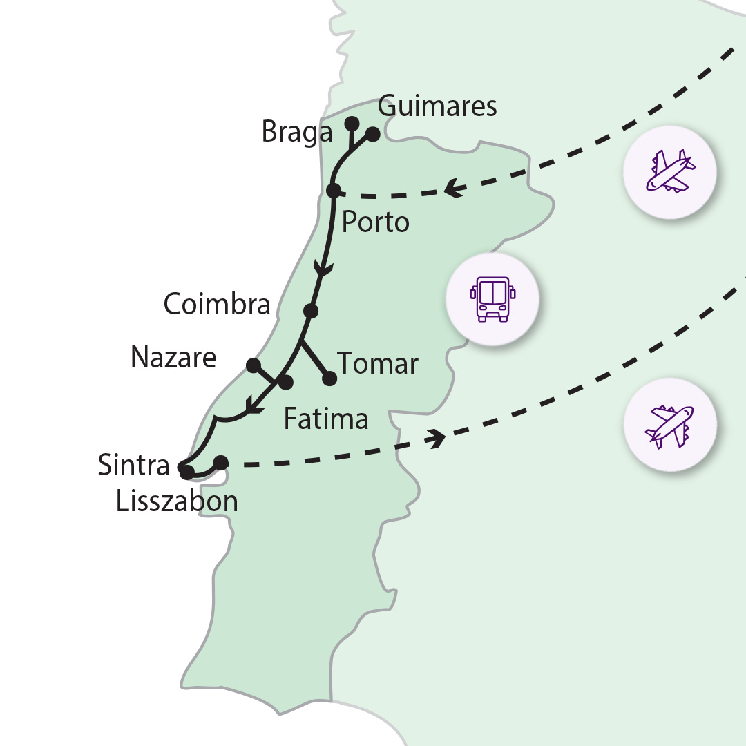 ">Guimaraest fedezzük fel, ez a város volt Portugália első fővárosa a XII. században. Főterei, utcái, városfalai és a várkastély, mind a portugál történelem kezdetéhez repítenek vissza bennünket. Folytatjuk utunkat Bragába, és közben megtekintjük