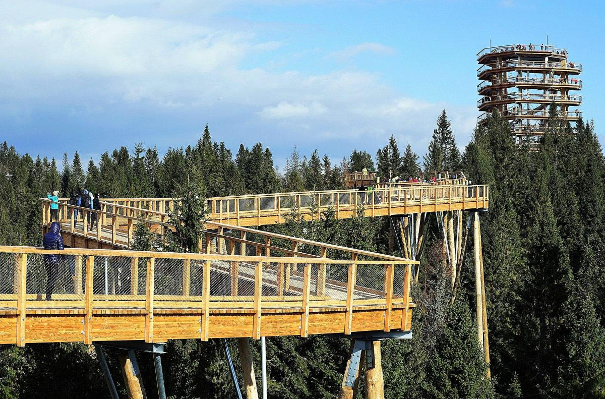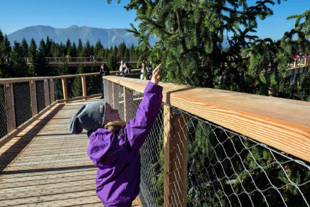 A barlanglátogatás után továbbutazunk a mintegy 10 km-re fekvő Zár községbe, ahol 2017 szeptemberében egyedülálló látnivalóval gazdagodott a Tátra: megnyitották a Lombkorona tanösvényt.