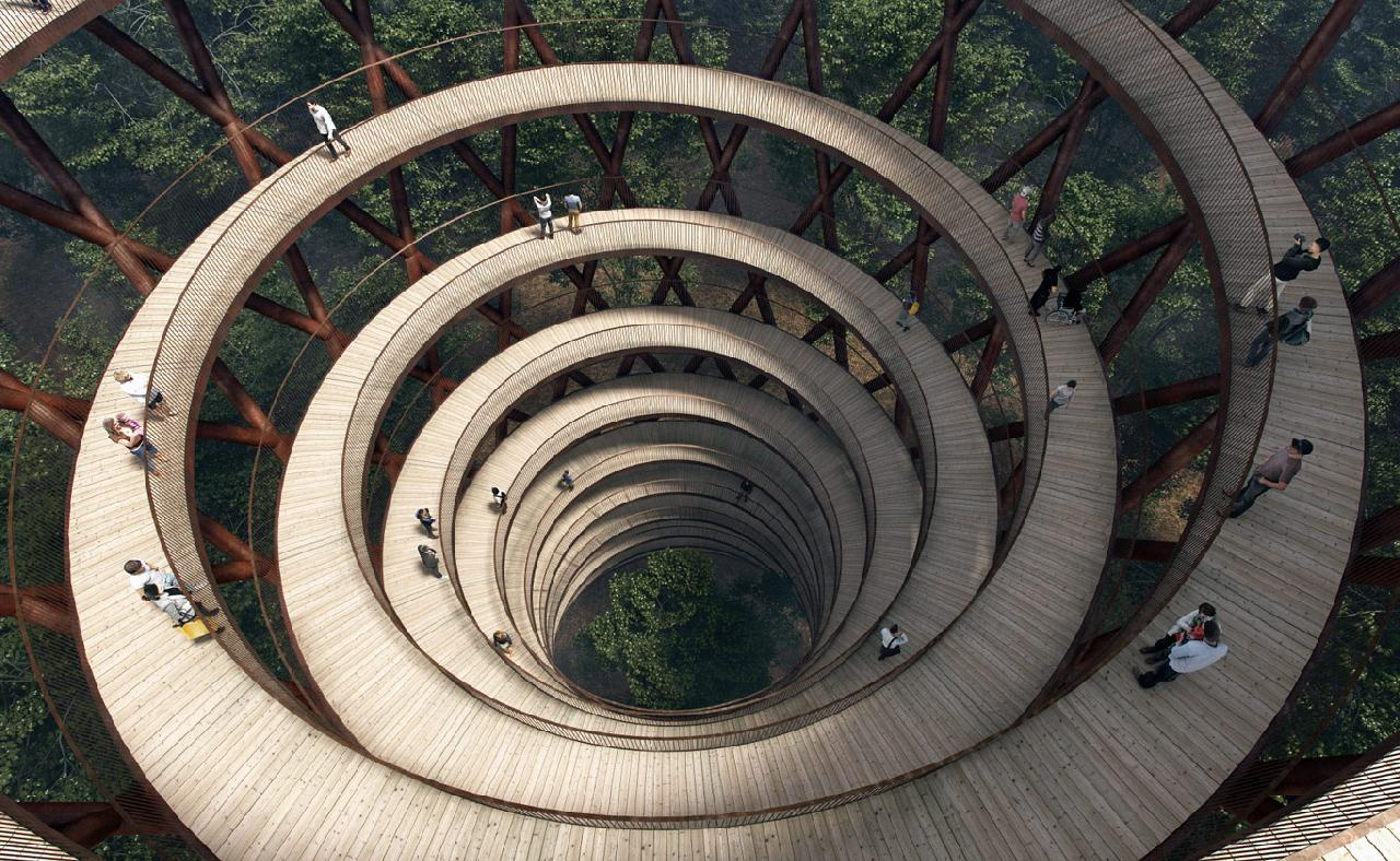 Miután az ösvényen visszakanyarodunk a belépőkapuhoz, annak közelében megpillantjuk a 32 méter magas, kb. 10 méter átmérőjű, fából ácsolt kilátótornyot, melynek tetejére annak külső részén 632 méter hosszú, mozgáskorlátozottak és kisgyermekes családok által is kényelmesen végigjárható, kígyószerűen tekergőző, kellemesen emelkedő járda vezet.