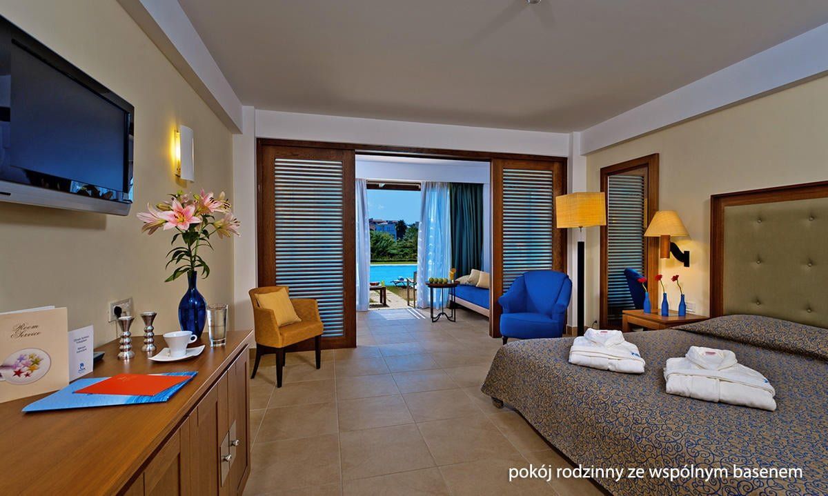 Oldalról vagy közvetlenül tengerre néző szobák, junior lakosztályok vagy családi szobák felár ellenében vehetők igénybe. A szobák részben fák által takart tengerre vagy a szálloda területére néző kilátással rendelkezhetnek. A junior suite szobák közvetlen kilátással rendelkeznek a medencére, és egy tágasabb szobát jelentenek. A családi szoba kb. kb. 40 m² egy fő hálószobából és egy pótágyazható nappaliból áll, melyeket tolóajtók választanak el egymástól.