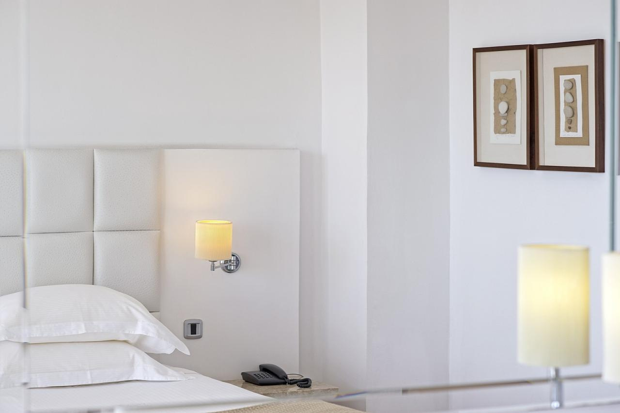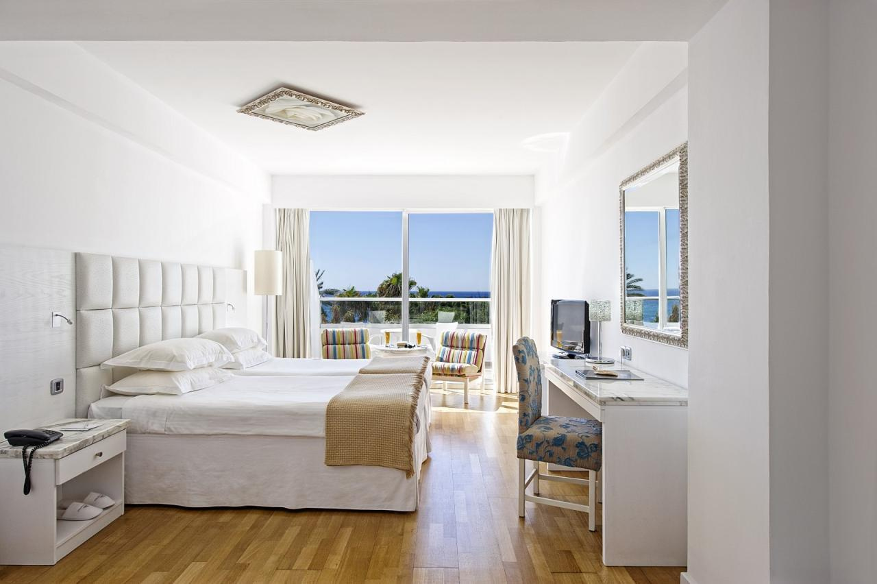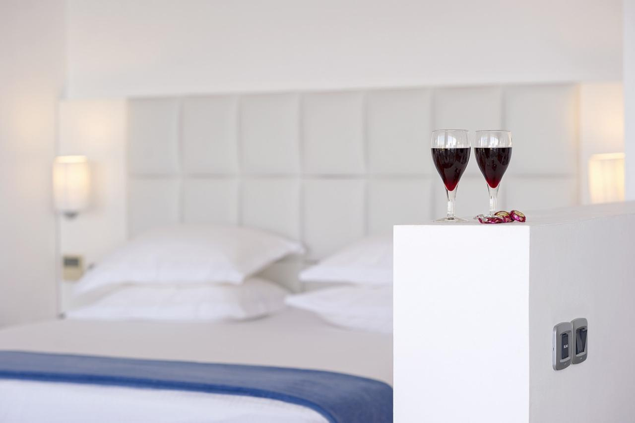 Szobák: A Grecian Sands Hotel 163 modern és elegáns szobát kínál, amelyek mindegyike kifinomult ízléssel van berendezve, hogy a vendégek a lehető legnagyobb kényelmet élvezhessék. Minden standard szoba komfortosan berendezett, egy hálószobás (~23 m2), légkondicionált, fürdőszobás, hajszárítóval, síkképernyős tv-vel, minibárral, vízforralóval (kávé és teafőzési lehetőség), telefonnal és széffel felszerelt. Minden szobához erkély tartozik szárazföldre, oldal tengerre vagy tengerre néző kilátással.