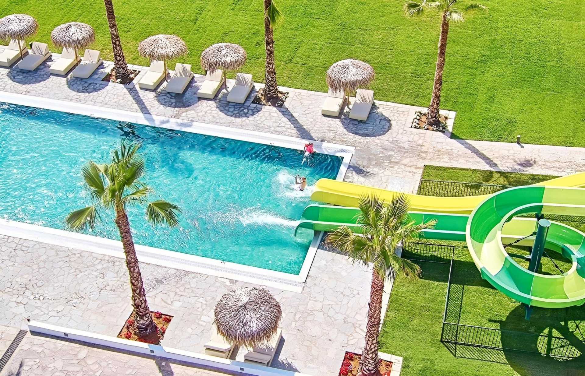 - 2 medence csúszdákkal (napágyak, napernyők és törölközők ingyenesen)