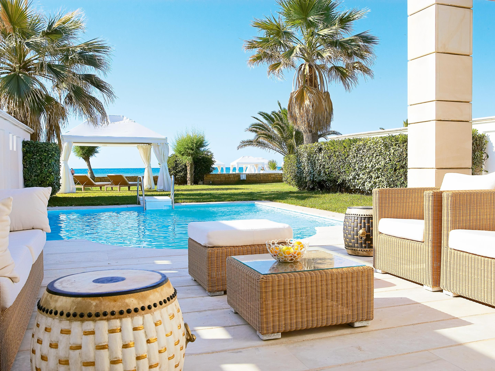 - medence (napágyak, napernyők és törölközők)