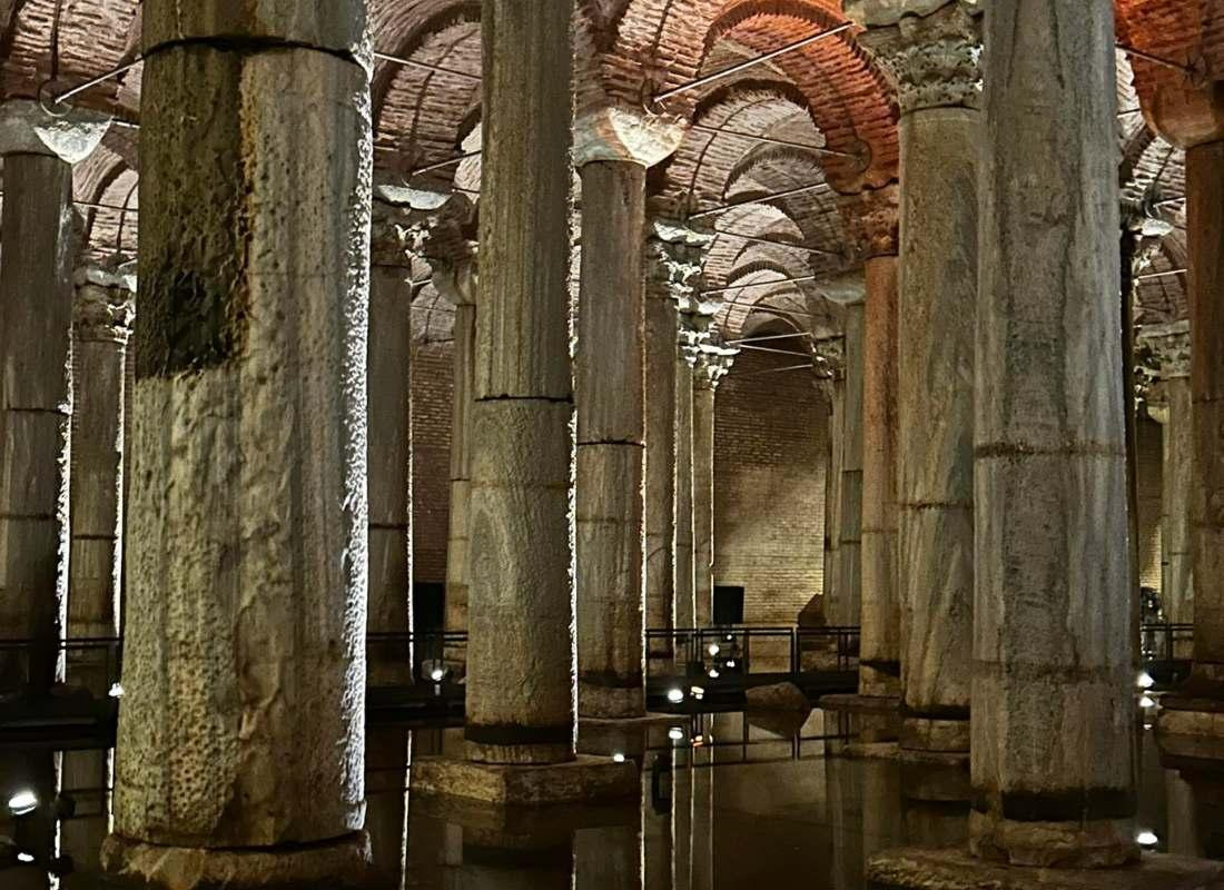 Elsüllyedt Palotában. Más néven Bazilika Ciszterna Isztambul egyik leglátványosabb bizánci kori víztározója, amelyet Justinianus császár építtetett a 6. században. Hatalmas oszloperdeje és misztikus, félhomályos hangulata miatt az egyik legkülönlegesebb földalatti látványosság. A ciszterna egykor az egész Nagy Palotát és környékét látta el vízzel, ma pedig modern fényekkel kivilágítva népszerű turistalátványosság.