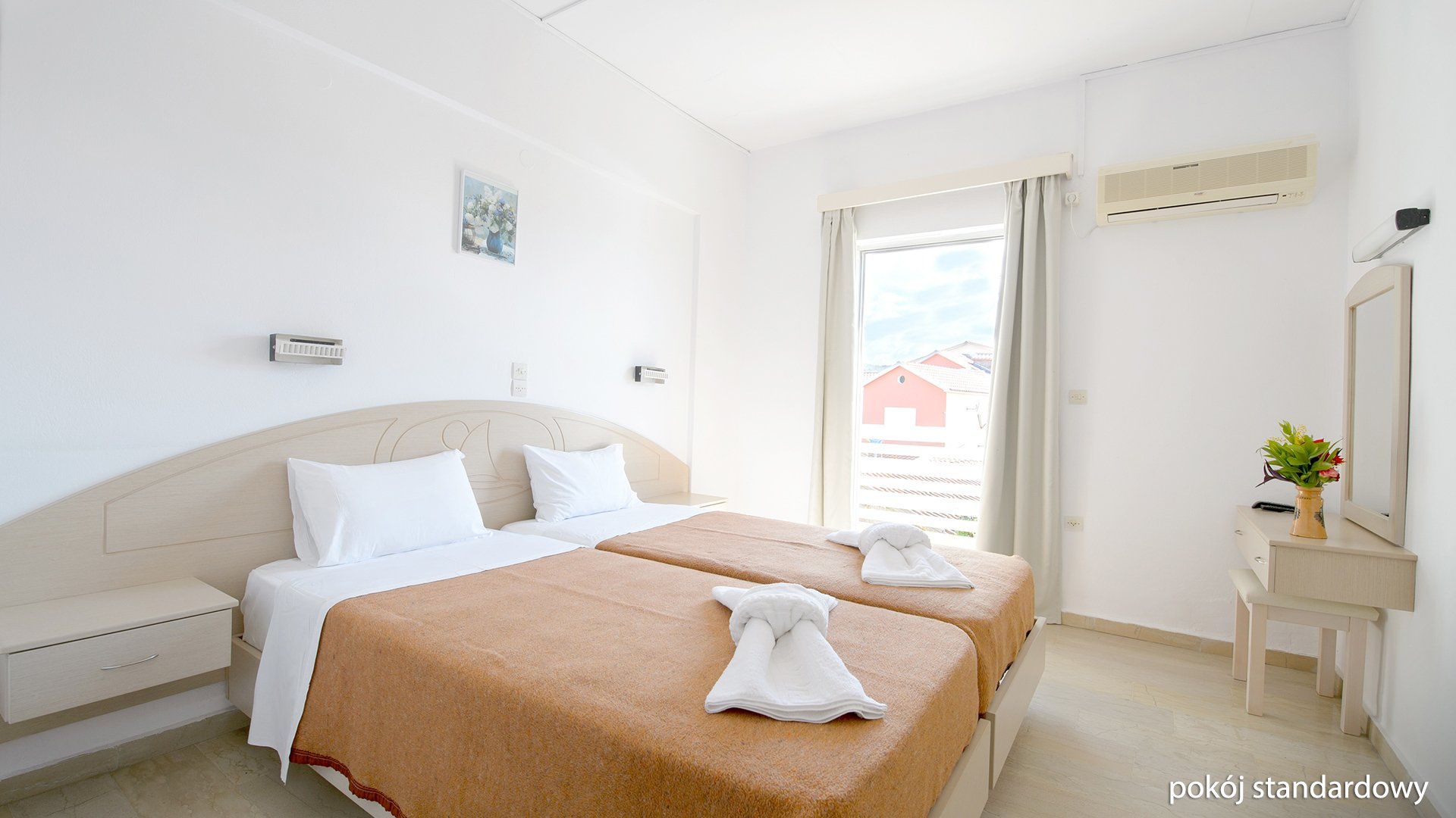 Standard: 2 ágyas (1 pótágy lehetséges egy gyermek számára), kb. 15-18 m2, kényelmesen berendezett, egyénileg szabályozható légkondicionáló (fizetendő: kb. 6 EUR/nap), fürdőszoba, műholdas TV, hűtőszekrény; ingyenes kiságy 2 év alatti gyermek számára érkezés előtt történő kérésre, kapacitás függvényében; erkély (asztal és székek). Családi: kb. 30 m2, két légteresek, az egyik szobában franciágy, a másik szobában két különálló ágy.