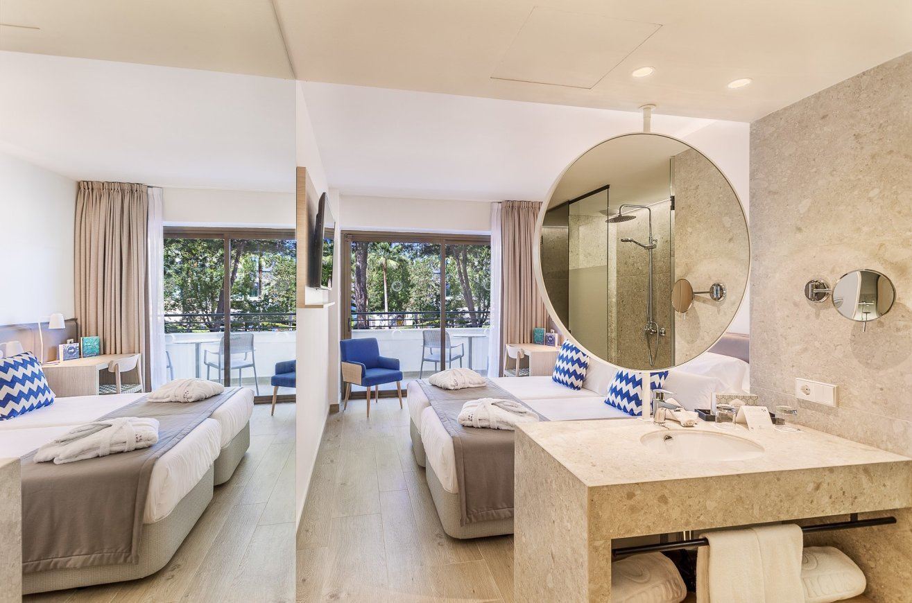 Kétágyas szoba: kb. 21 m². A szoba rendelkezik gardróbbal, teljes fürdőszobával, hajszárítóval, WiFi-vel, Nespresso kávégéppel és hozzá tartozó kapszulával, széffel, papuccsal, telefonnal, TV-vel, köntössel, terasszal, légkondicionálóval, illetve minibárral (további költség).