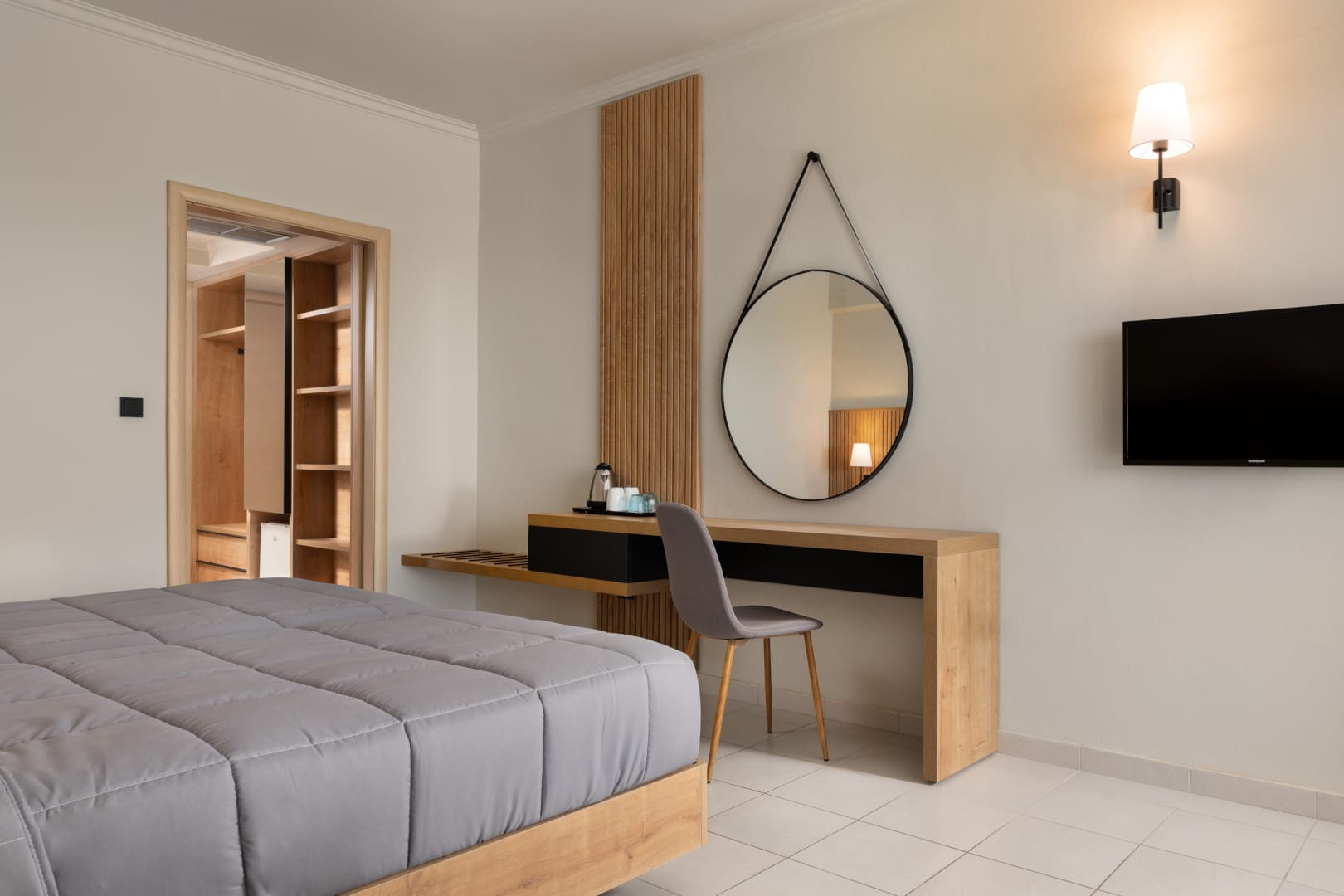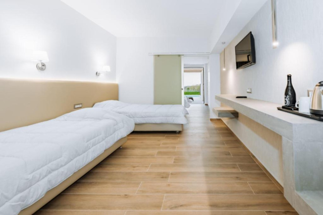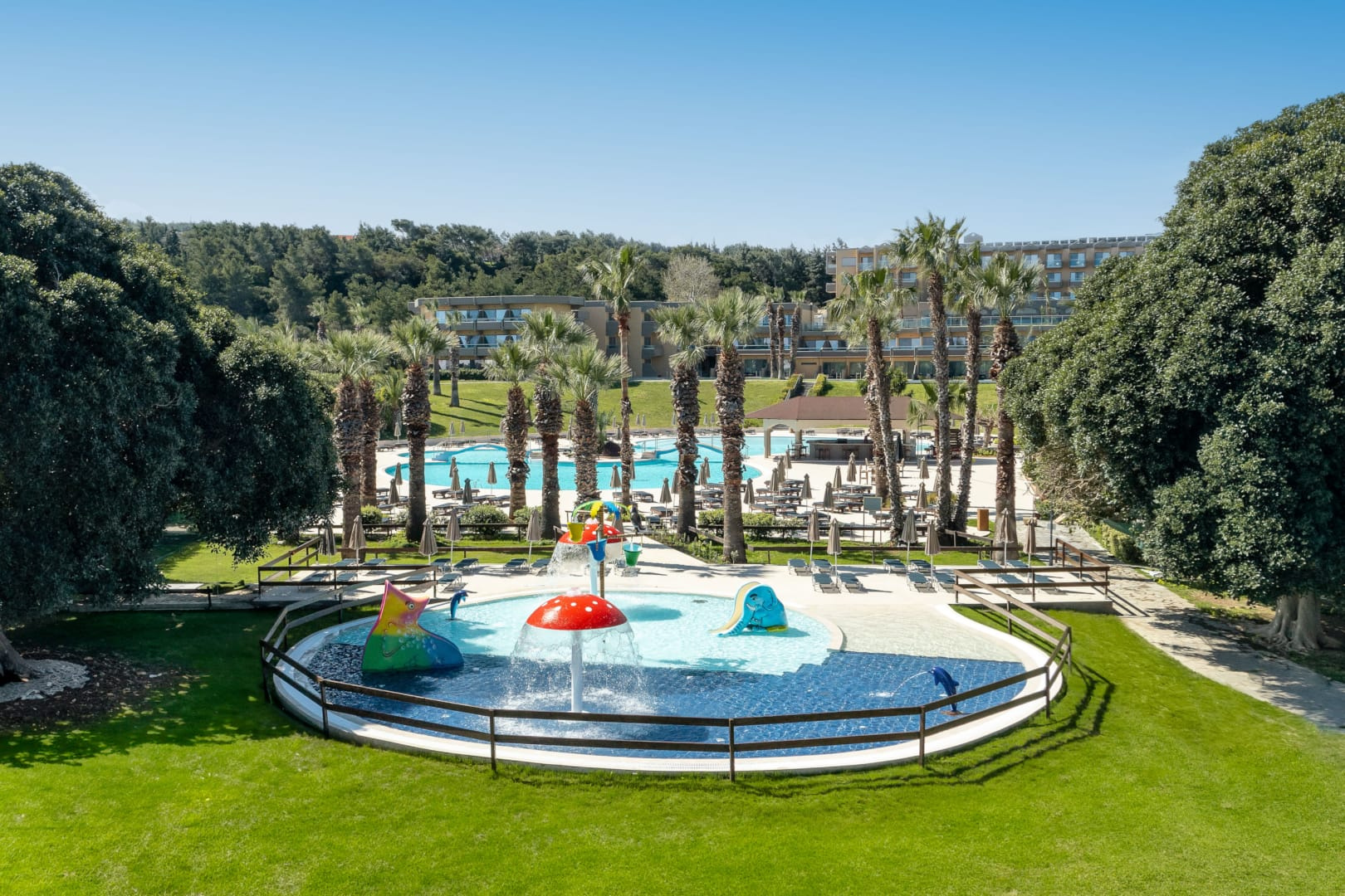 Fekvése: Domboldalon épült 282 szobás modern hotel, több két-háromszintes (lift) épületből áll, fantasztikus kilátással a kalitheai öbölre, tengerpartig húzódó, hatalmas (60.000 m2) gondozott kertje, pálmafákkal, virágokkal, mediterrán növényekkel van beültetve. A saját kiépített sziklás öbölben levő kavicsos/homokos kis tengerpartra (a kerten keresztül, lépcsősoron lehet lejutni, 300 m). Szolgáltatások: Recepció, társalgó, TV sarok, étterem, bár, pool bár, a kertben nagyméretű felnőtt/gyerekmedencék (ingyenes napágy/napernyő), ingyenes WIFI (a recepciónál), játszótér, parkoló áll a vendégek rendelkezésére. A vendégek aktív kikapcsolódását naponta különféle animációs és kulturális programok (görög est, zenés estek, bingo, quiz), fitness, asztali tenisz, aerobic, mini golf, parkoló szolgálják. Felár ellenében széf, internet, mini bár, napágy/napernyő a tengerparton, wellness részleg (masszázs, jacuzzi, szauna), röplabda, kosárlabda, tenisz, biliárd, videojátékok, gyerekfelügyelet, ruhatisztítás, fodrász, szobaszerviz, pénzváltás, ajándékbolt, autó/motorbérlés helyben kérhető/igénybe vehető. Ellátás: Félpanzió (büfé reggeli/vacsora, az étteremben a férfiaknak hosszú nadrág viselete kötelező). Elhelyezés: Kényelmes, modern bútorokkal berendezett, kertre néző, kétágyas (pótágyazható) szobában, központi légkondicionáló (június 15.- szeptember), sat TV, zenecsatorna, telefon, mini hűtő, hajszárító, fürdőszoba/WC, balkon/terasz.