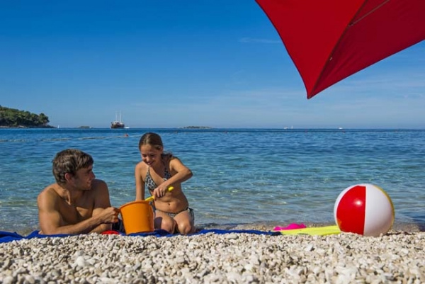 Fekvése: Porec óvárosától 5 km-re, Zelena Laguna üdülőtelepen, zöld környezetben, a kavicsos és kiépített tengerparttól 200 m-re található. A strand lépcsőkön közelíthető meg. Az egyik részén mozgólépcső található, mely a reggeli órákban lefelé megy, déltől pedig felfelé. A strandon nyugágyak és napernyők bérelhetők.