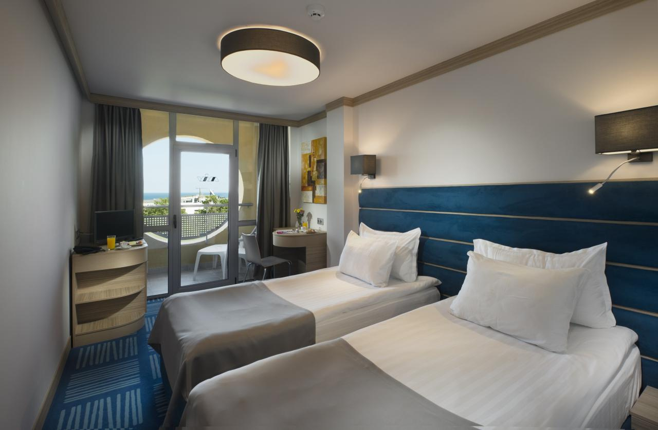 Kétágyas szoba kb. 17 m2 (max. 2+0 fő) 2 normál ágy található benne. A szobák felszereltsége: fürdőszoba zuhanyzóval és hajszárítóval, kapszulás kávéfőző (naponta feltöltve – az árban benne), széf (felár ellenében), minibár (naponta feltöltve ásványvízzel, üdítőitalokkal, vörös- és fehérborral, sörrel, csokoládéval, pörkölt dióval, chips-szel, zselés cukorkákkal – az árban benne), közvetlen telefonvonal, központi légkondicionáló, erkély asztallal és székekkel. Babaágy nem áll rendelkezésre.